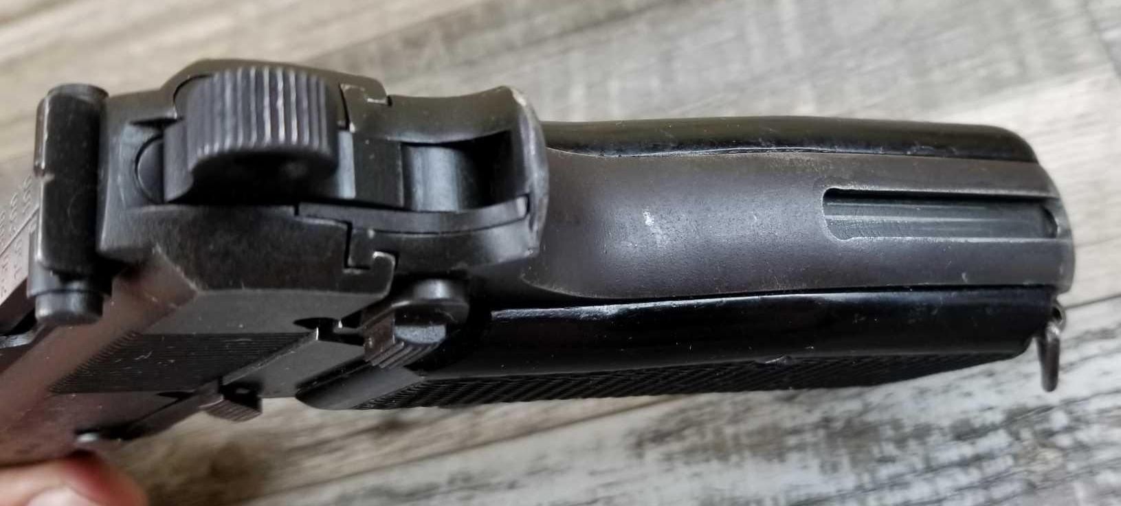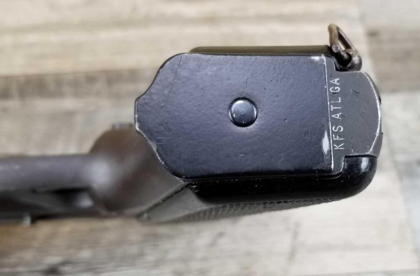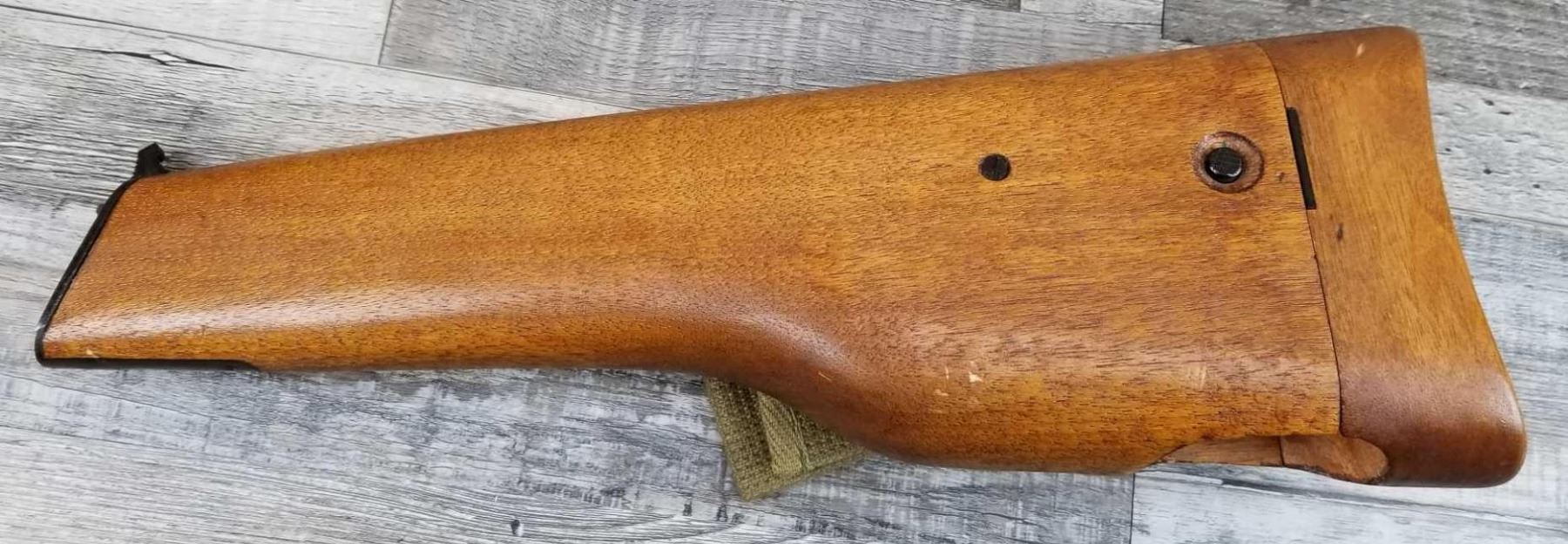 TANGENT REAR SIGHT. COMES WITH STOCK/HOLSTER. WAR TIME FINISH. MATCHING NUMBERED. BORE IS VERY GOOD. GOOD WORKING ORDER. COMES WITH TWO HI-CAP MAGS, IN CA NO MAG.
