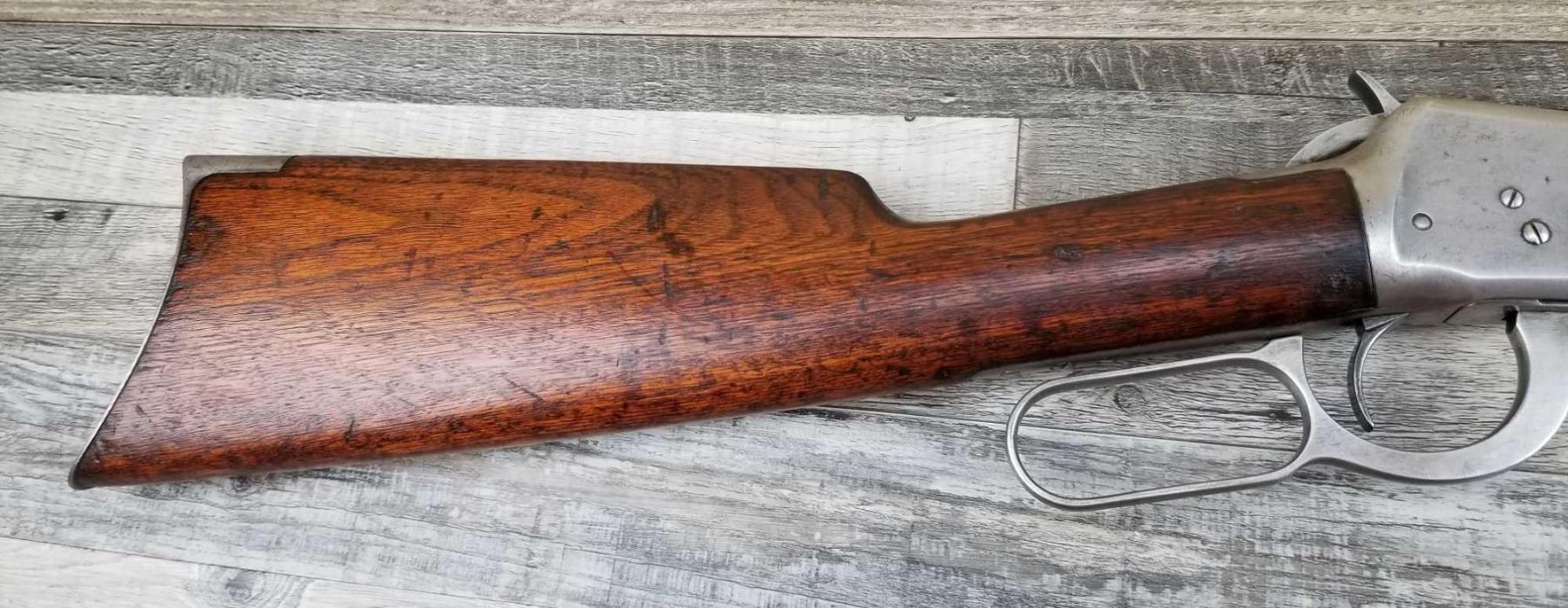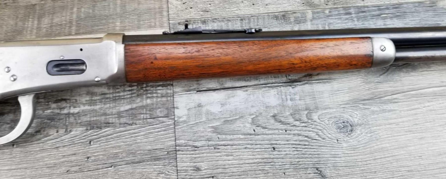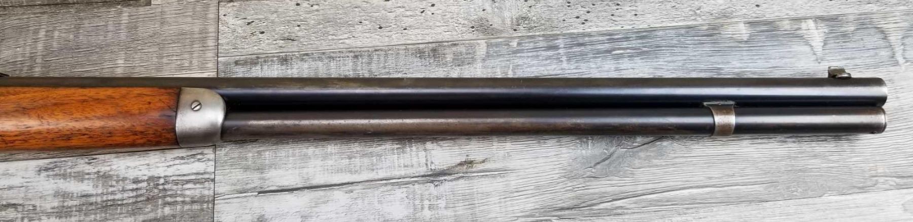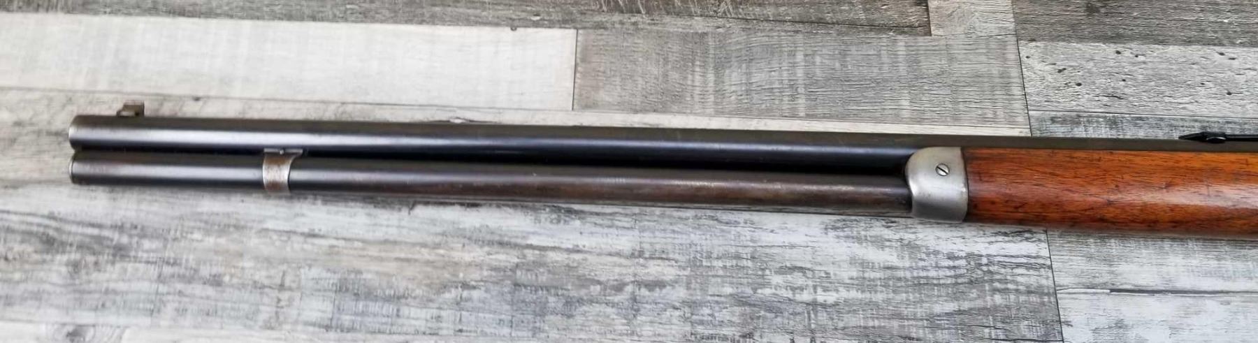 NO FINISH REMAINS ON RECEIVER OR LEVER. 60% ON BARREL AND MAG TUBE. APPEARS TO FUNCTION WELL. BRIGHT BORE.