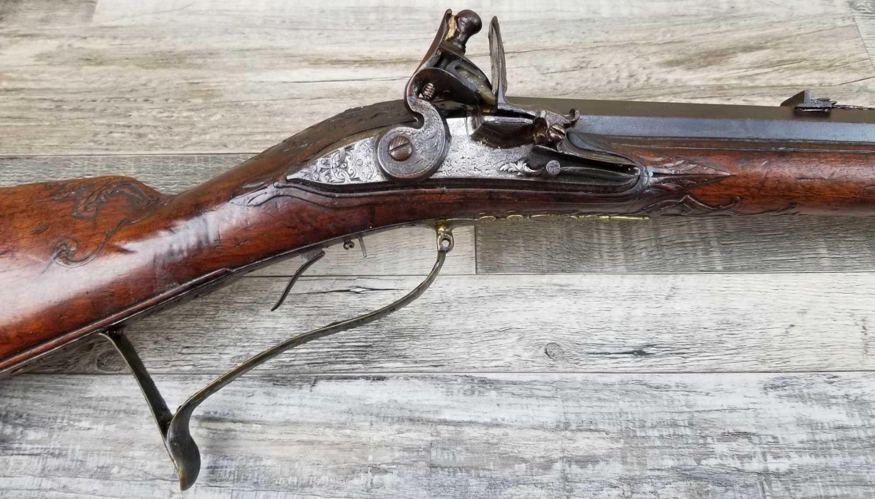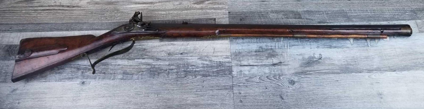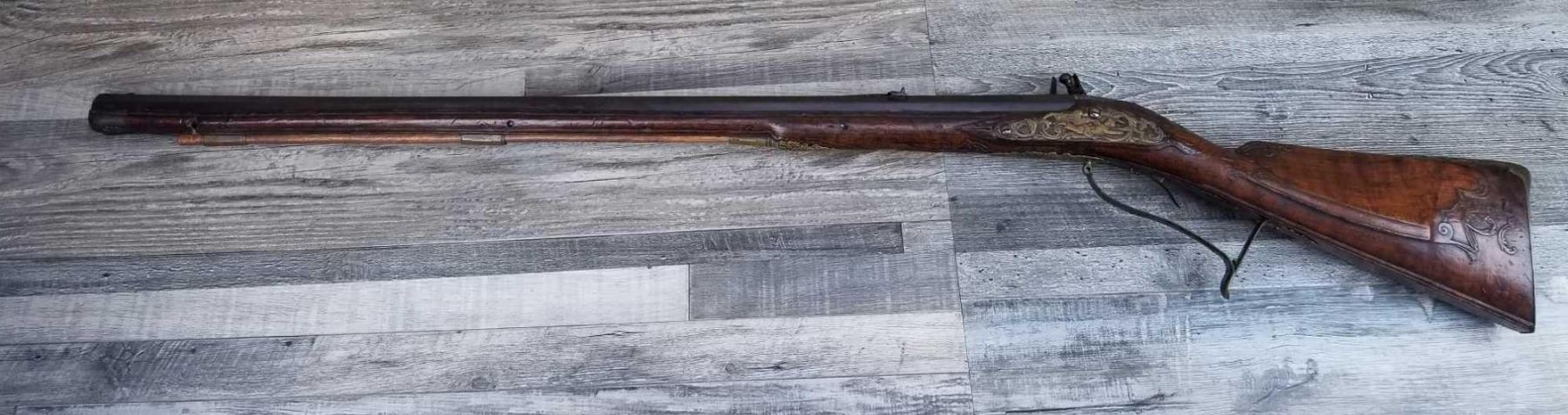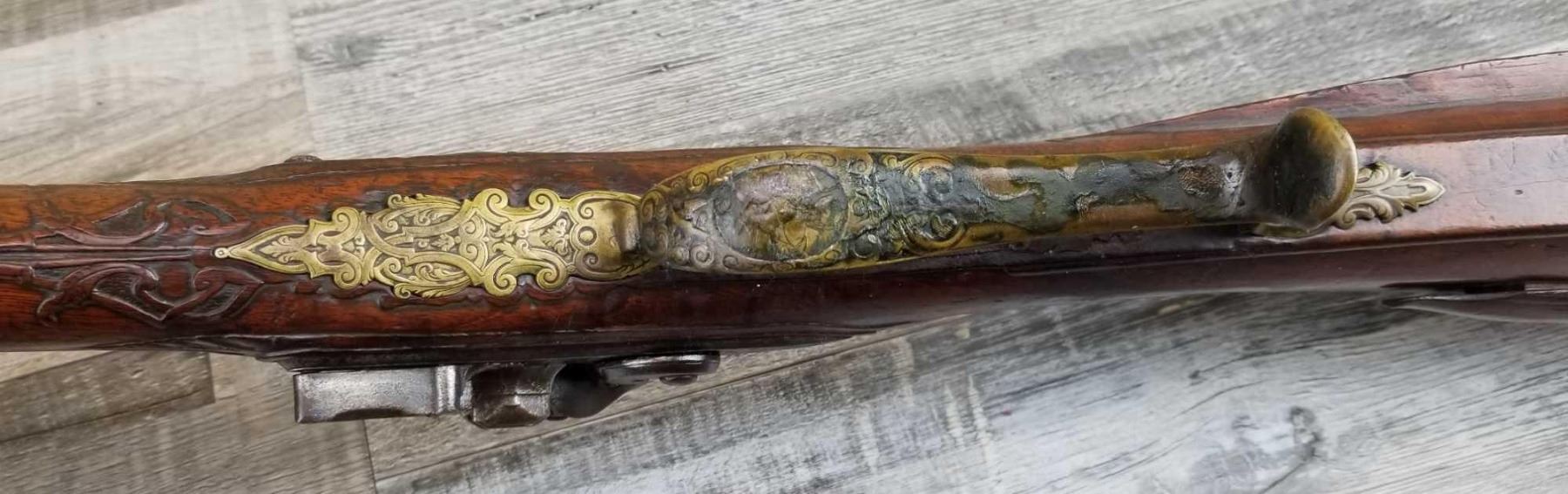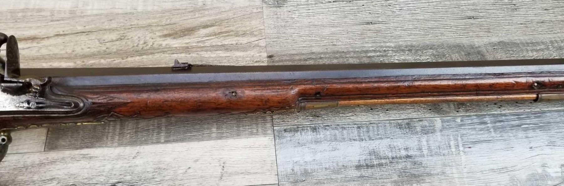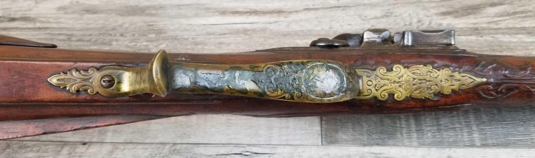 SAME STYLE RIFLE USED IN AMERICAN REVOLUTION. ORNATE LOCK OF EAGLE ATTACKING MAN IN TURBAN ON LEFT. ENGRAVED BRASS THROUGHOUT. PATCHBOX HAS TWO FLINTS. ENGRAVED STOCK. INTERESTING GUN. EXPRESS SIGHTS. APPEARS TO BE IN WORKING CONDITION.