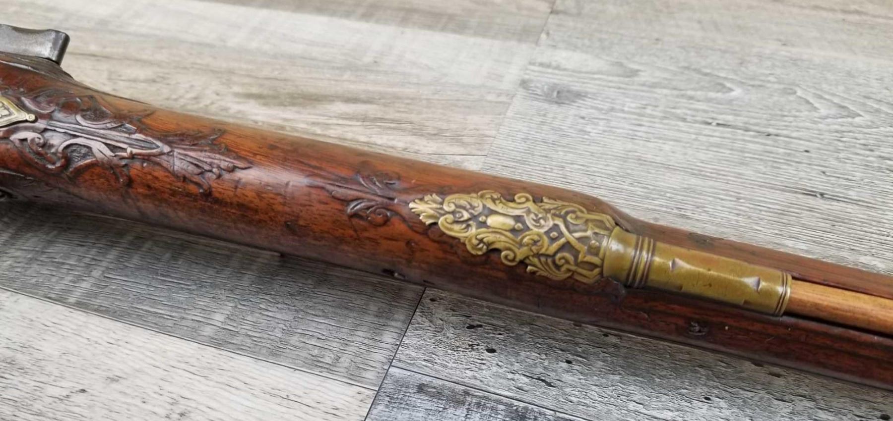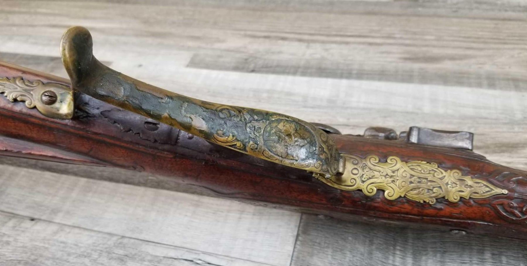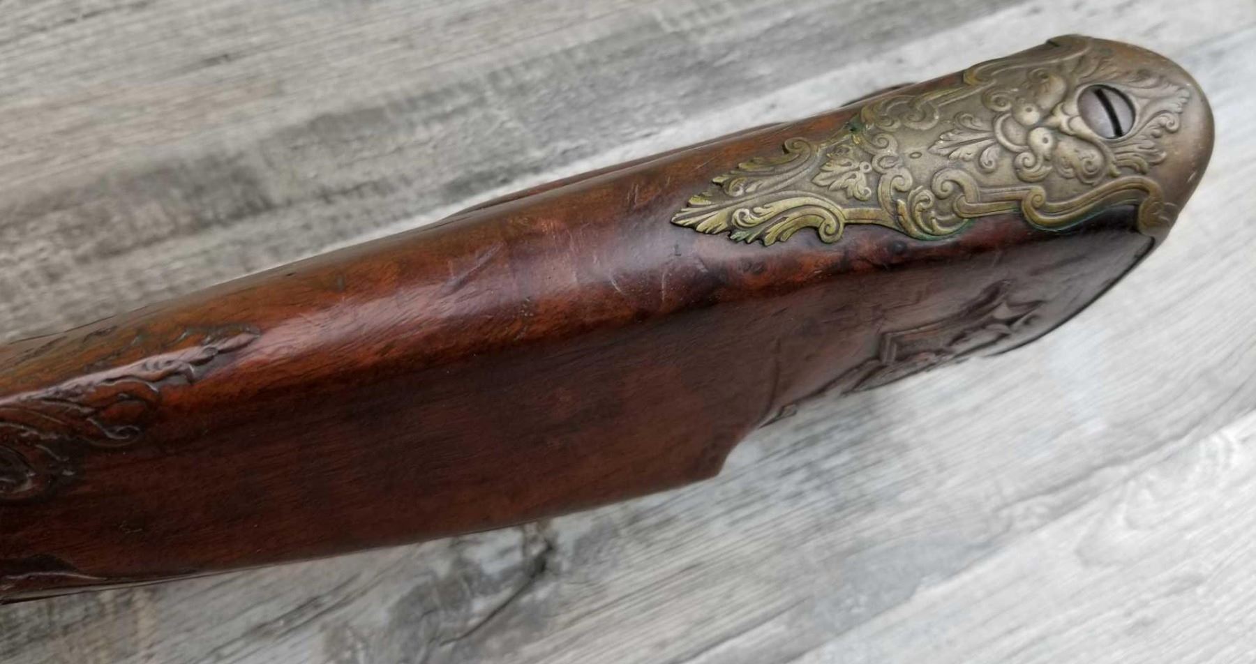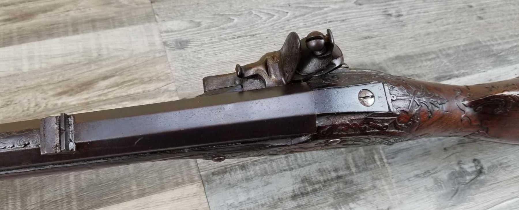 SAME STYLE RIFLE USED IN AMERICAN REVOLUTION. ORNATE LOCK OF EAGLE ATTACKING MAN IN TURBAN ON LEFT. ENGRAVED BRASS THROUGHOUT. PATCHBOX HAS TWO FLINTS. ENGRAVED STOCK. INTERESTING GUN. EXPRESS SIGHTS. APPEARS TO BE IN WORKING CONDITION.