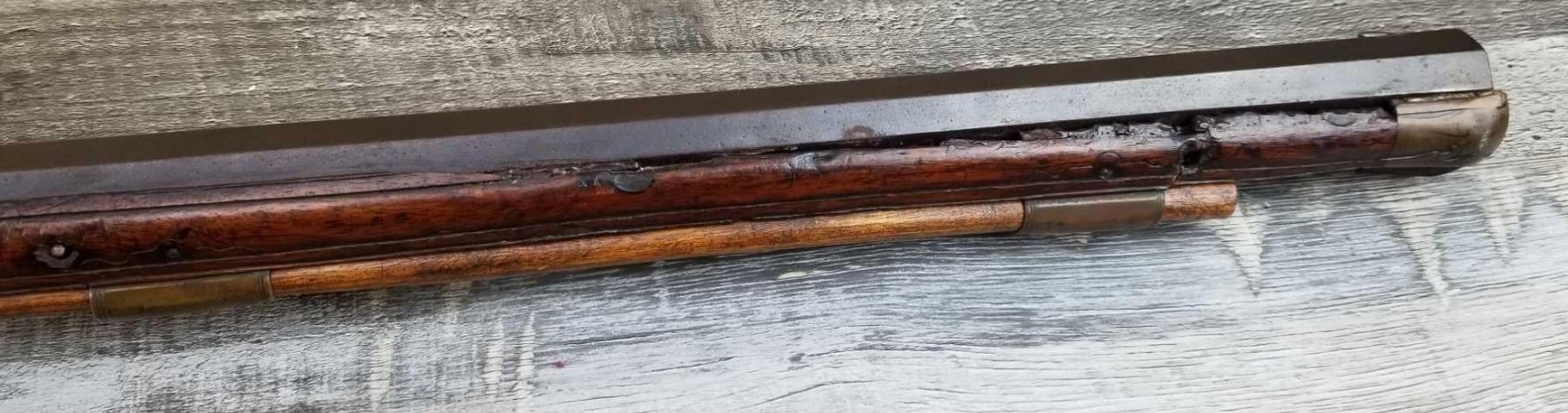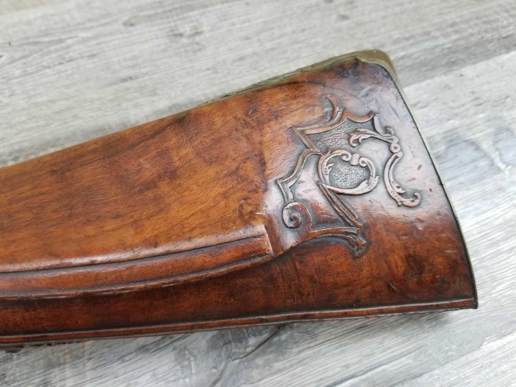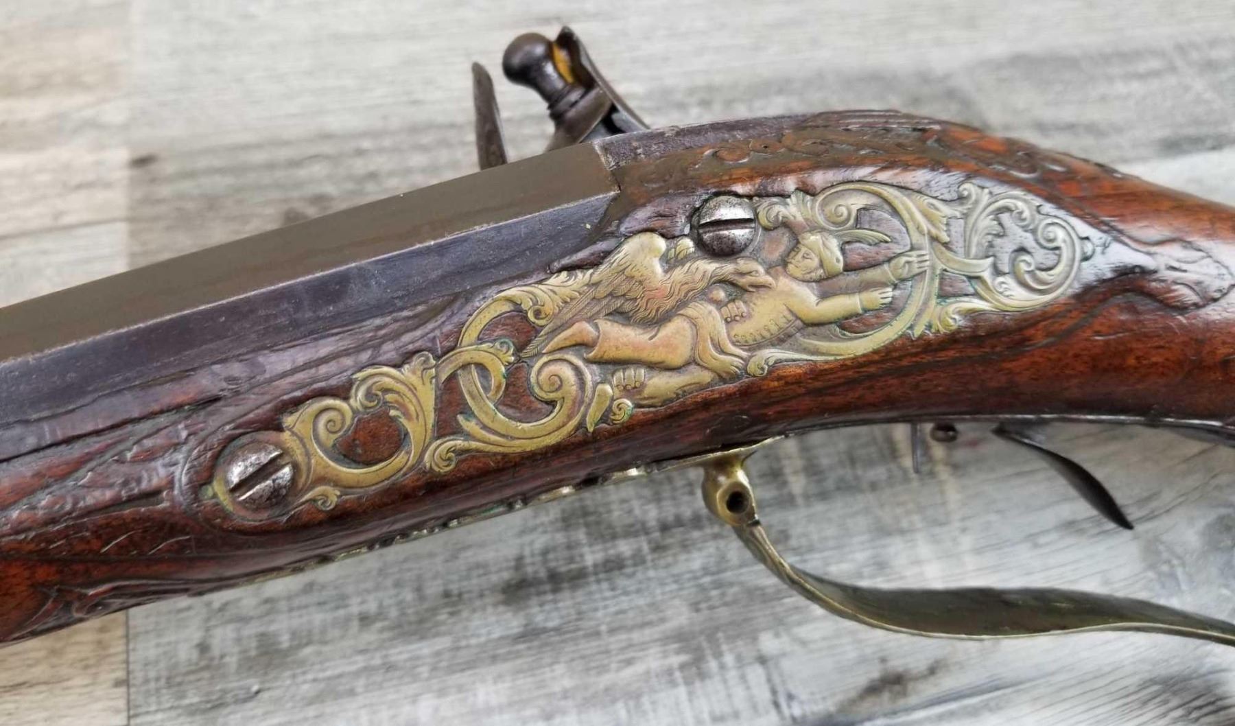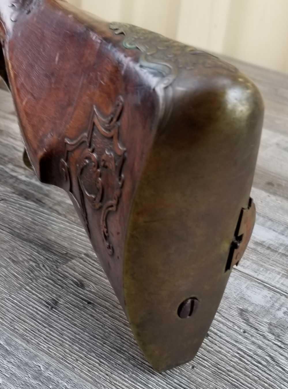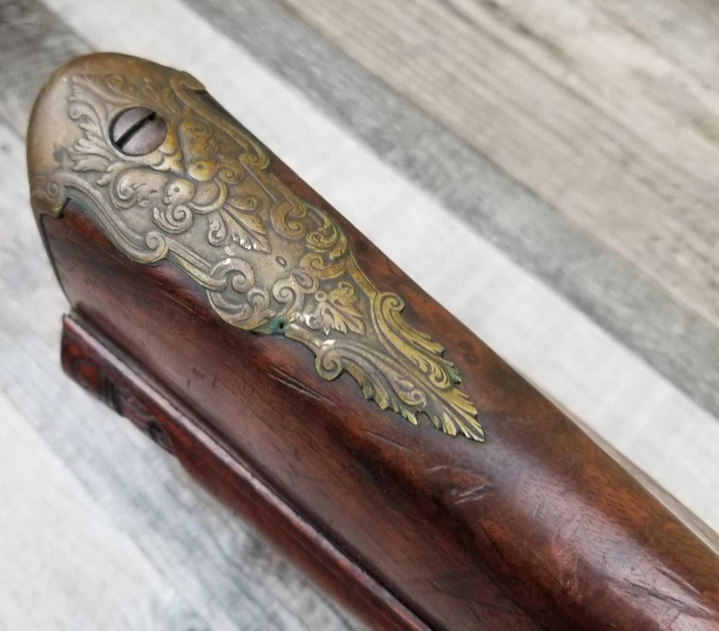 SAME STYLE RIFLE USED IN AMERICAN REVOLUTION. ORNATE LOCK OF EAGLE ATTACKING MAN IN TURBAN ON LEFT. ENGRAVED BRASS THROUGHOUT. PATCHBOX HAS TWO FLINTS. ENGRAVED STOCK. INTERESTING GUN. EXPRESS SIGHTS. APPEARS TO BE IN WORKING CONDITION.