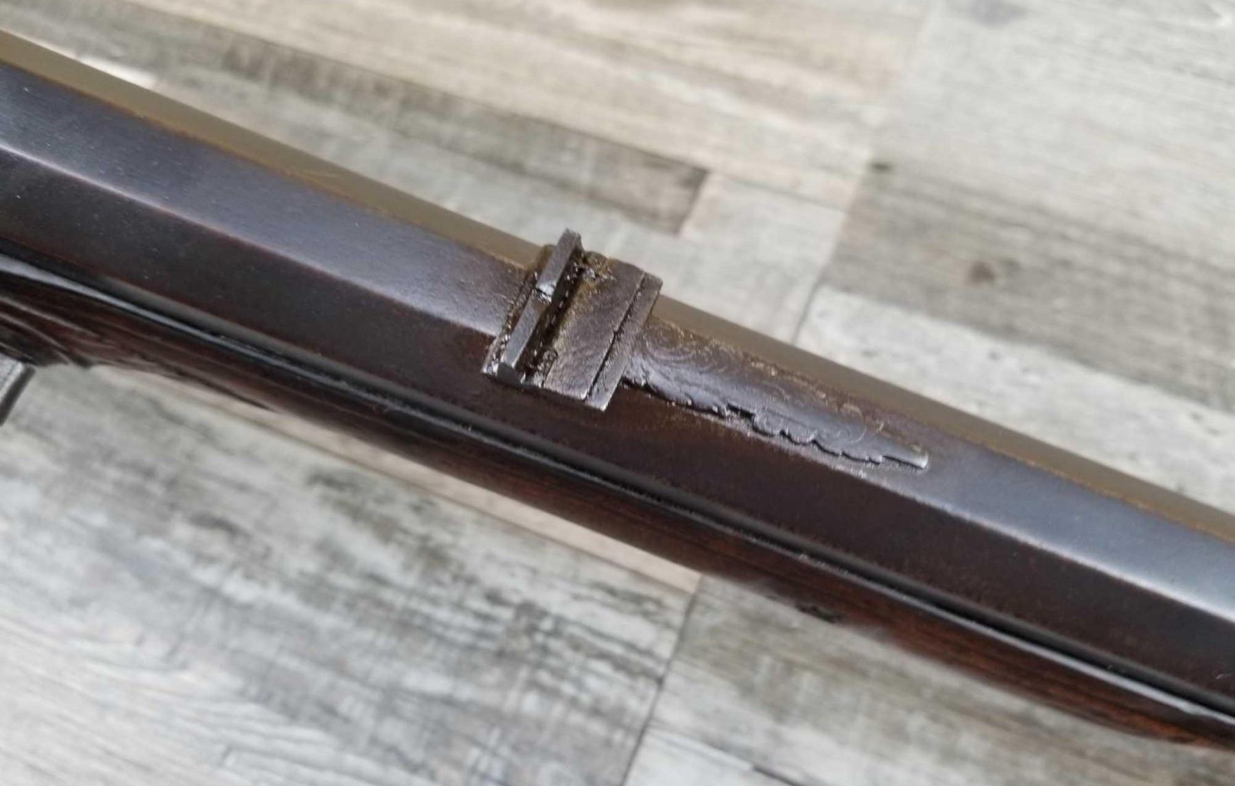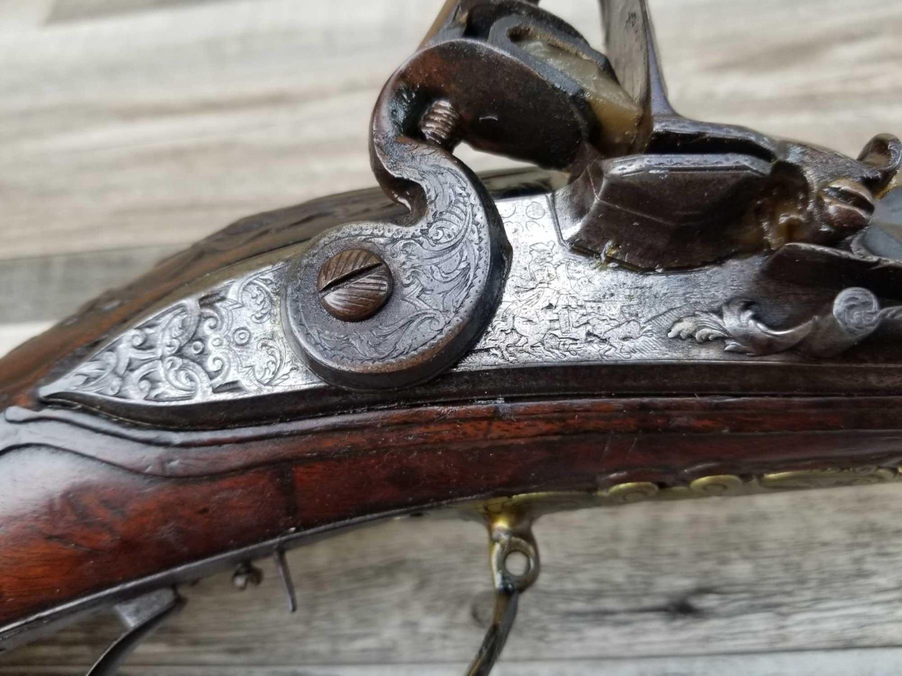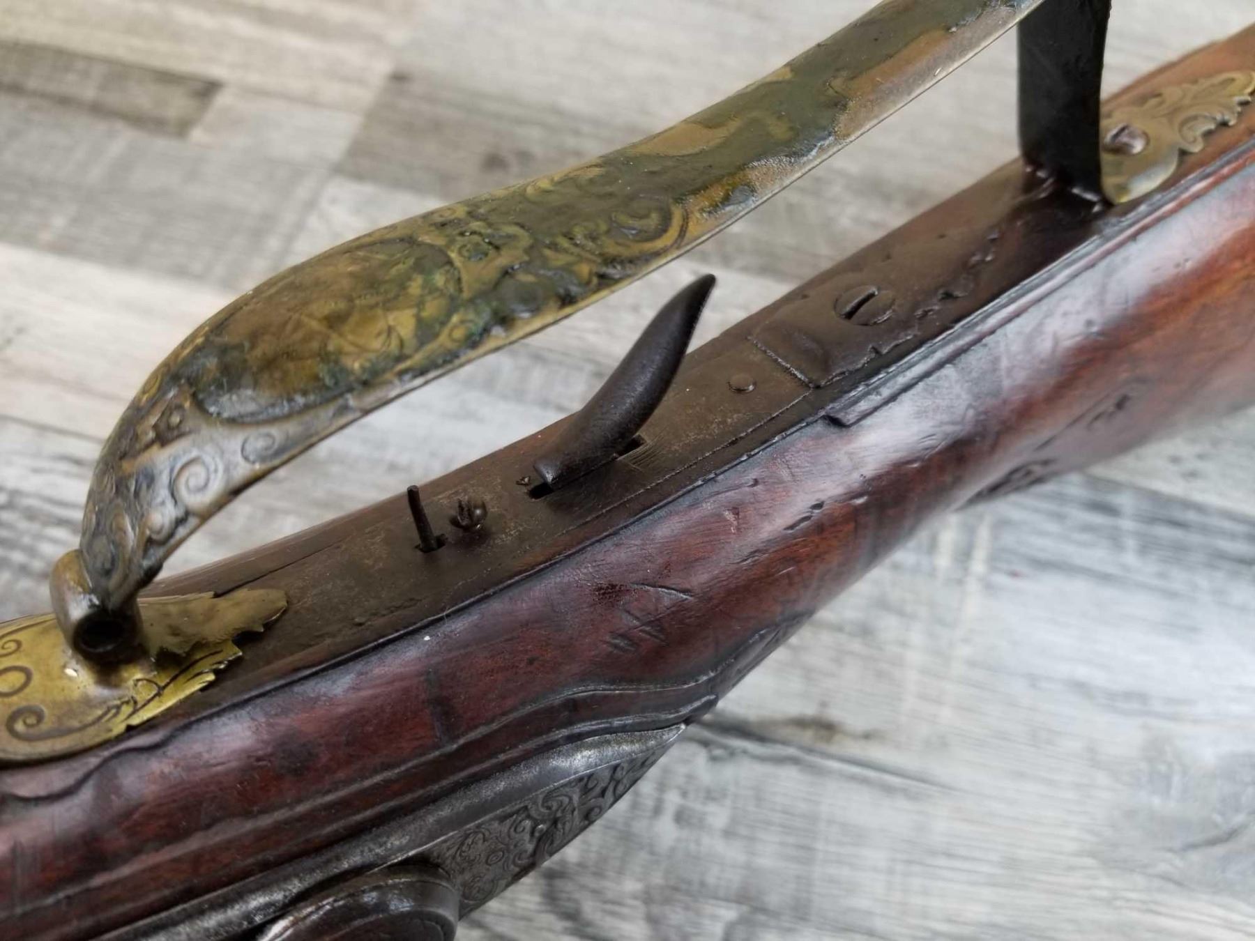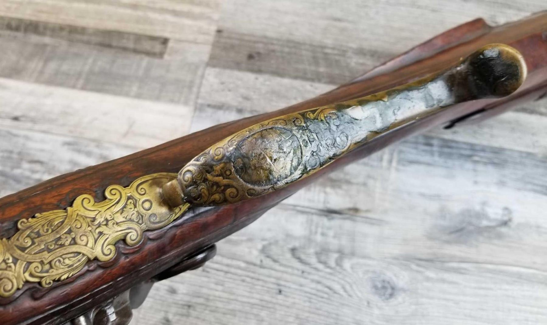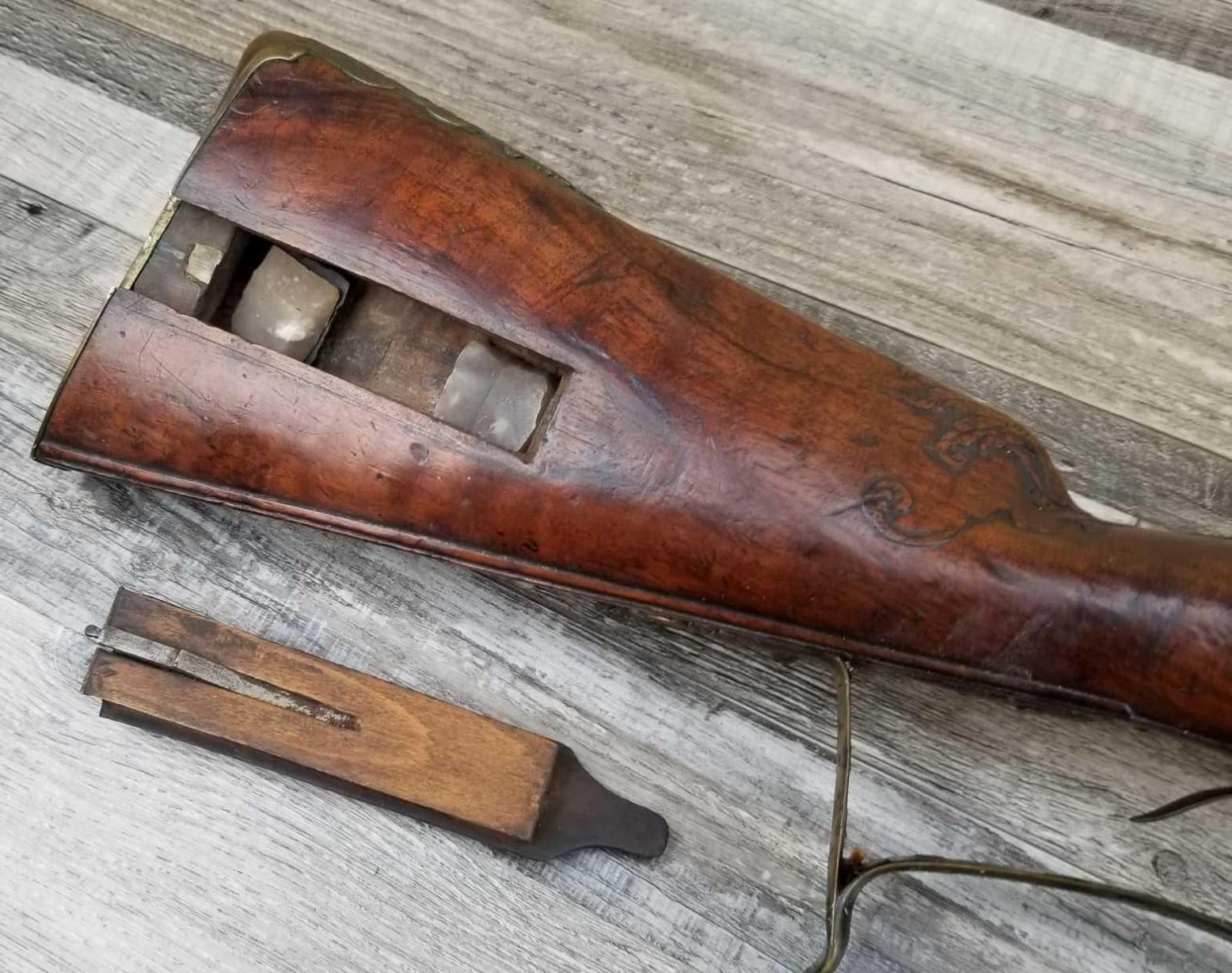 SAME STYLE RIFLE USED IN AMERICAN REVOLUTION. ORNATE LOCK OF EAGLE ATTACKING MAN IN TURBAN ON LEFT. ENGRAVED BRASS THROUGHOUT. PATCHBOX HAS TWO FLINTS. ENGRAVED STOCK. INTERESTING GUN. EXPRESS SIGHTS. APPEARS TO BE IN WORKING CONDITION.