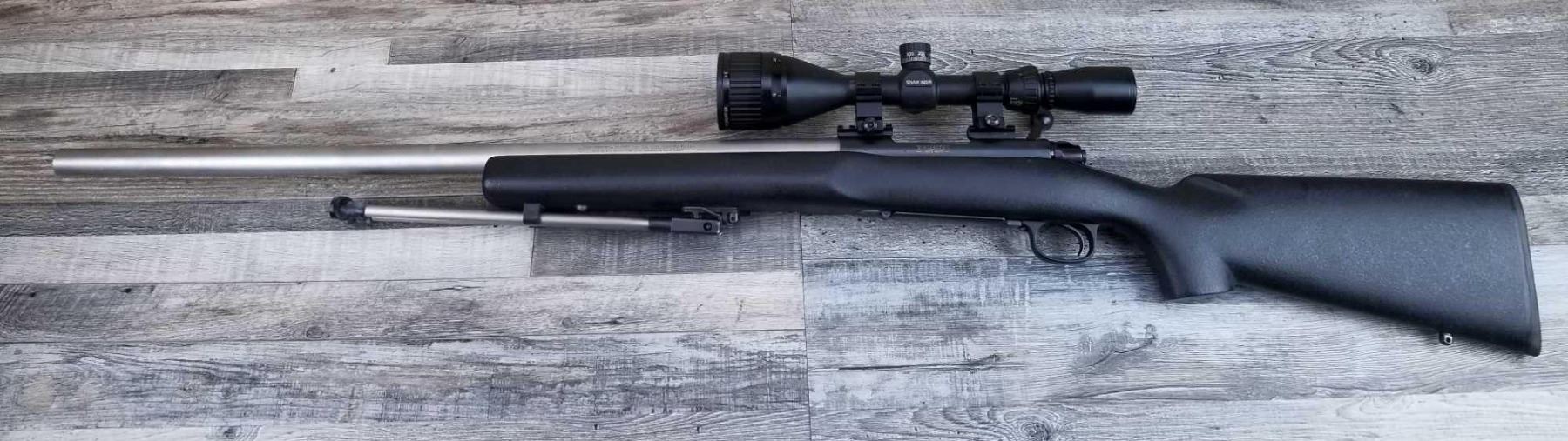 FACTORY HEAVY BARREL. ATTACHED BI-POD. HEAVY VARMINT MODEL. SIMMONS 3.5X10 SCOPE.