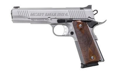 All Desert Eagle 1911 series 70 slide and frame rails are machined to aerospace tolerances, delivering accuracy that will match any custom gun. Offered in both Chrome Moly and Stainless and feature stainless match barrels, G-10 grips, light triggers with zero creep, and a stainless beavertail grip safety. The G (5” barrel) and C (4.33” barrel) models are equipped with fixed combat sights and the Undercover “U” (3” barrel) models come with an adjustable rear sight. Desert Eagle 1911s chambered in 45 ACP all have a traditional feed ramp machined into the frame, while all 9mm pistols have a ramped barrel with fully supported chamber. Only the 1911G models have a traditional barrel bushing in the slide. The 1911C and U models feature a bushingless slide and bull barrel. With the shorter slides of the C and U models, the bushingless slide allows for a longer recoil spring and ensures reliable function. Includes two 8-round magazines.