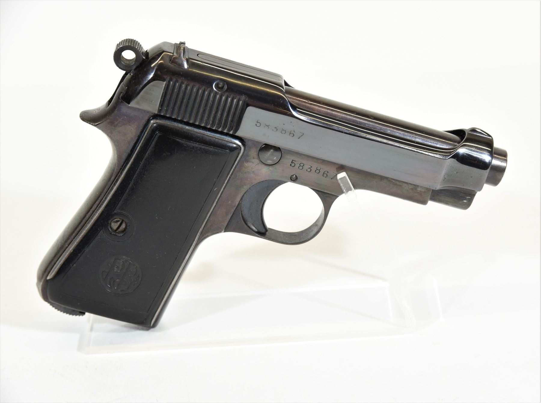 Prohibited, semi auto, 9mm Browning Short, 87mm barrel, SN 583867. Grips have some marks, bluing appears refinished, bore good.