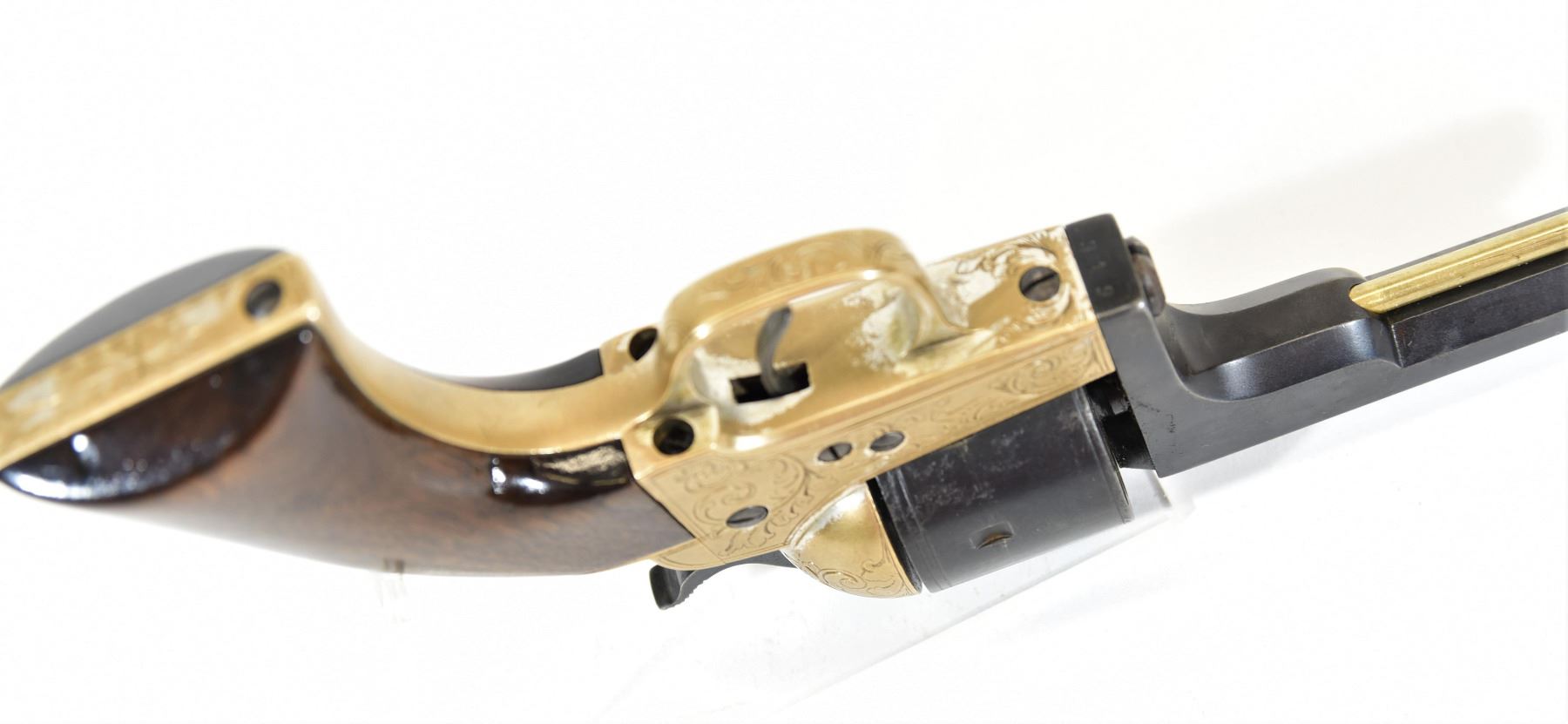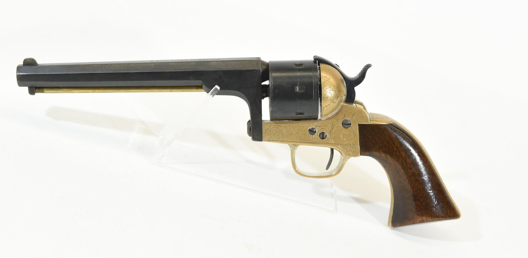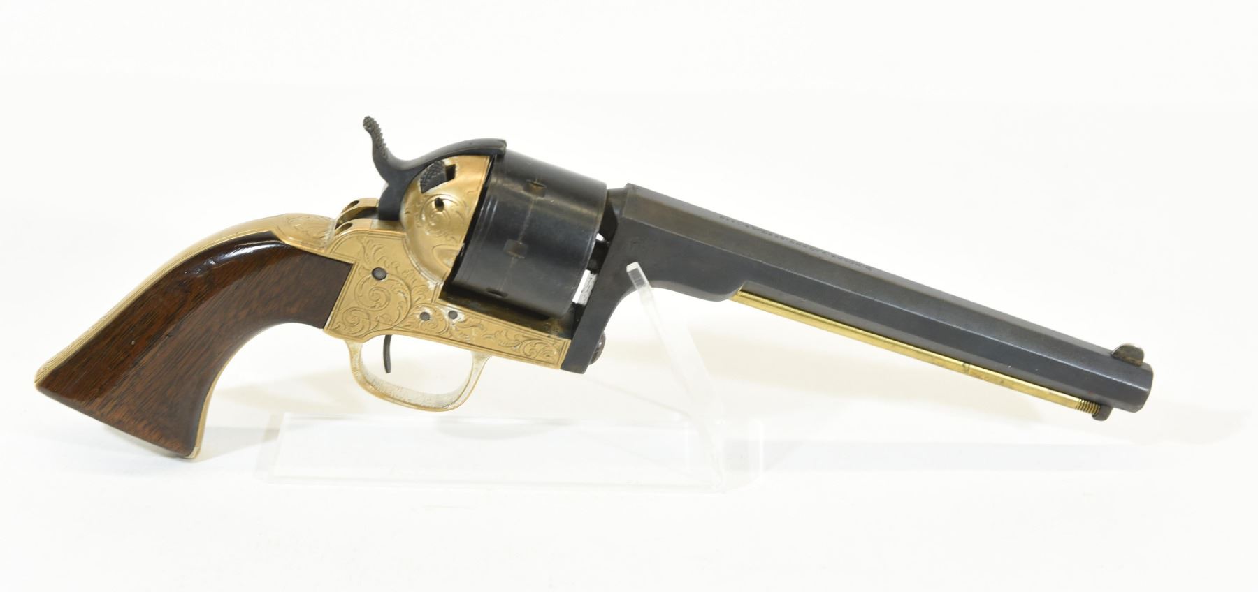 Antique, revolver, 32 RF, 152mm barrel, SN 919. Wood grips refinished, bluing is faded with light pitting, brass coloring worn off in places , bore pitted, rifling evident.
