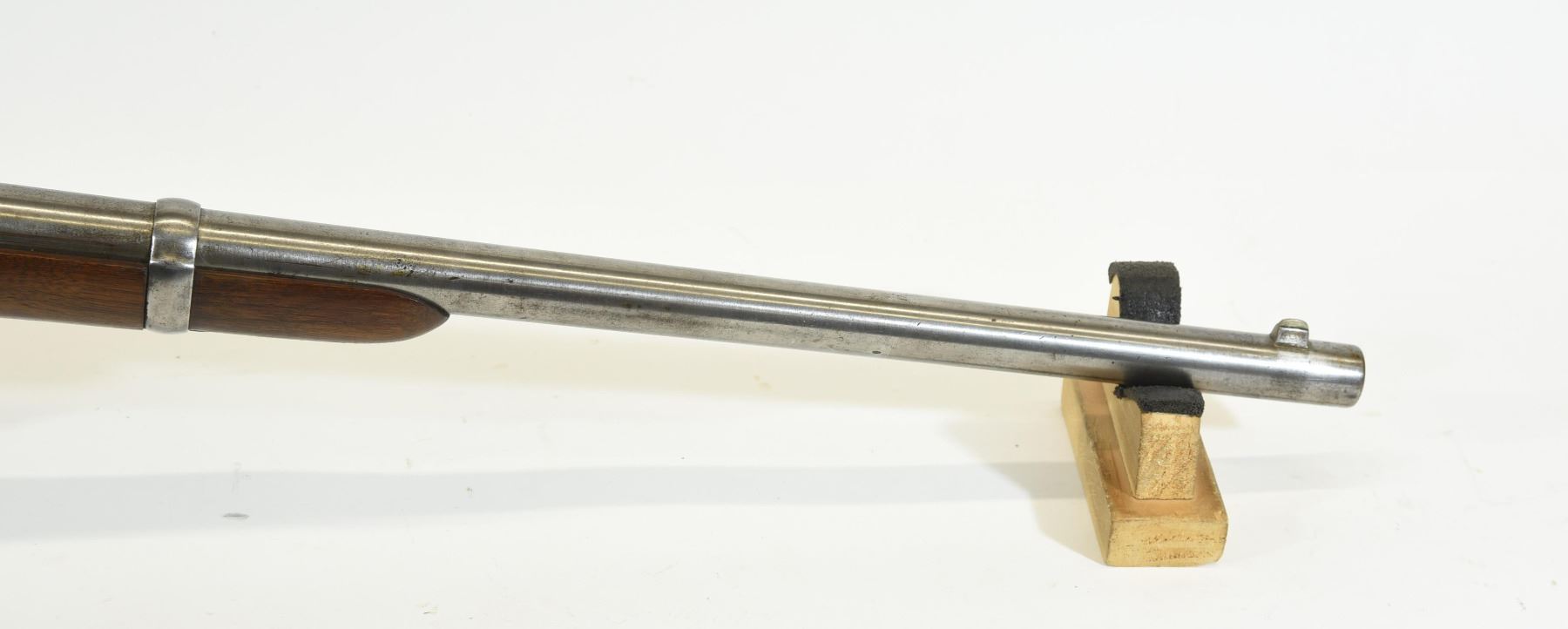 Antique, single shot, 52 percussion, 22" barrel, SN 89333. Wood has a few dents and bruises, bluing is grey, bore has light pitting throughout, rifling prominent. Sliding sling ring on left wrist, RS Lawrence patent sight. Stamped C Sharps Patent Sept 12th 1848, RS Lawrence Patent Sept 12th 1859 and C Sharps Patent October 5th 1852.