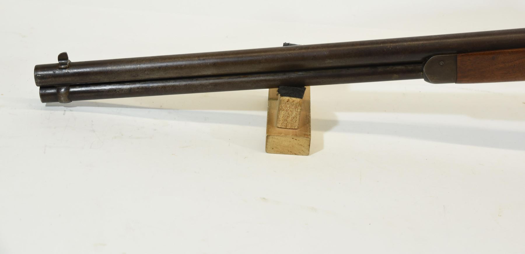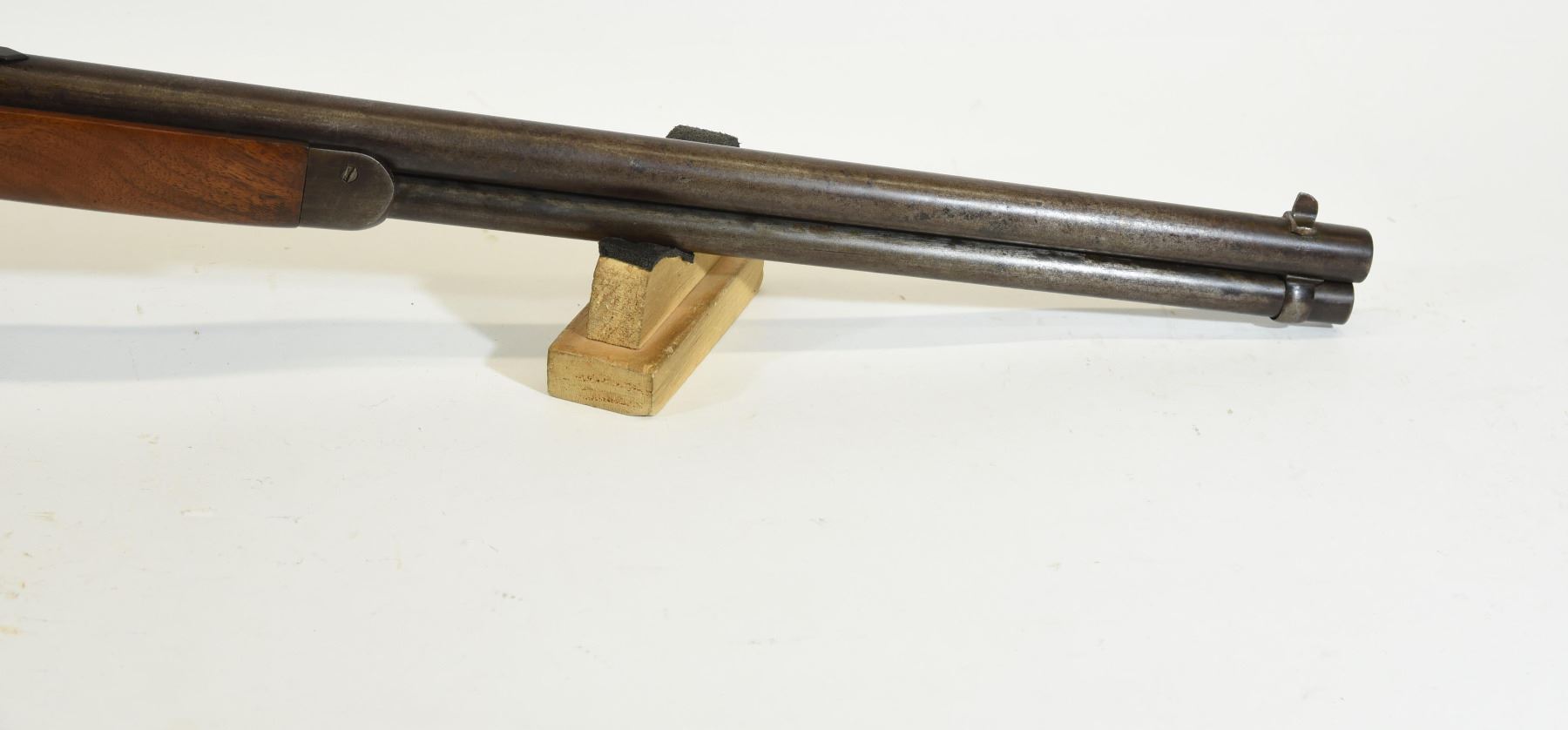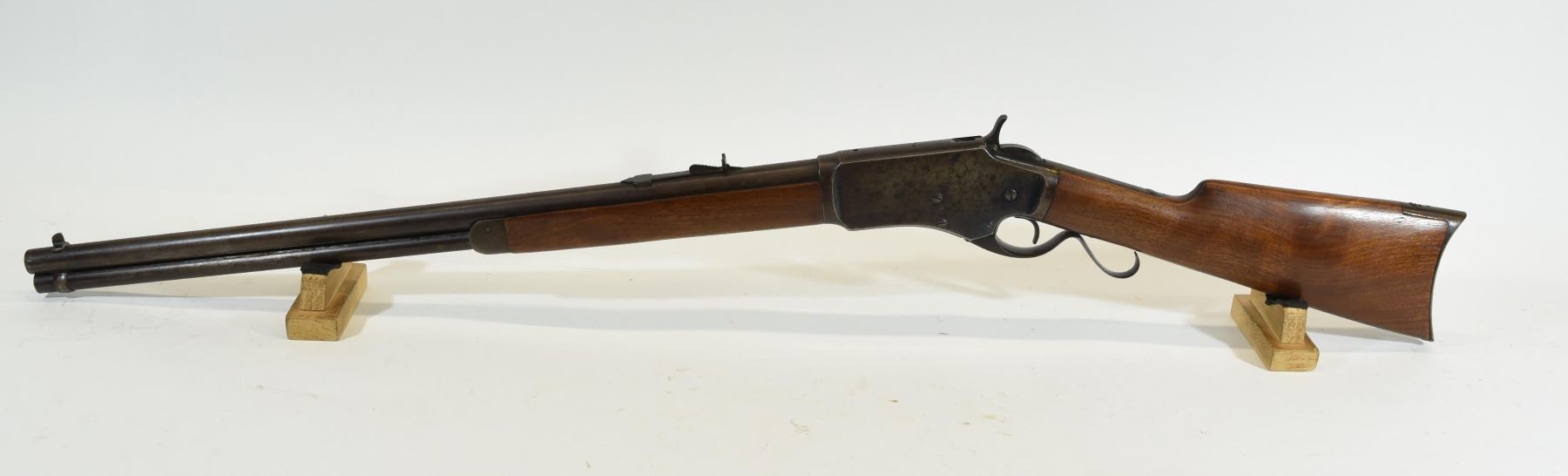 Non-restricted, lever action, 44 Cal CF, 24" barrel, SN 1125. Wood has some scratches, bluing is brown, bore has light pitting, rifling prominent.