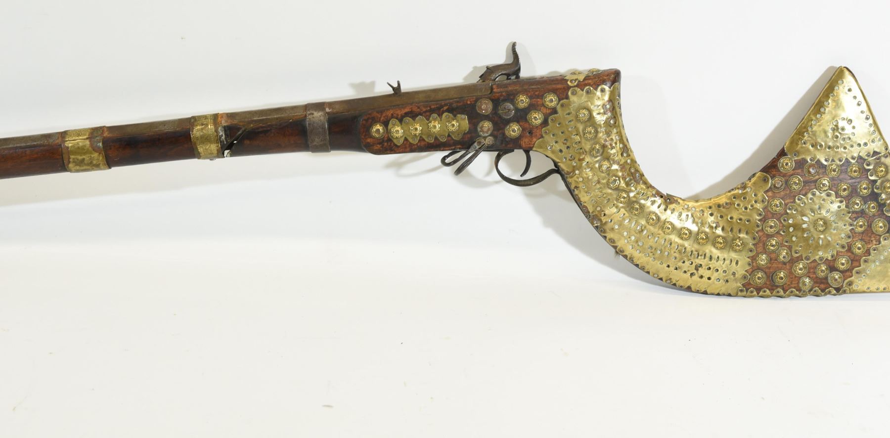 Antique, single shot, 11mm?, 32" octagonal barrel, SN none. Wood is covered in brass artwork, split at second band, missing 6" at front. Bluing is brown, bore pitted.