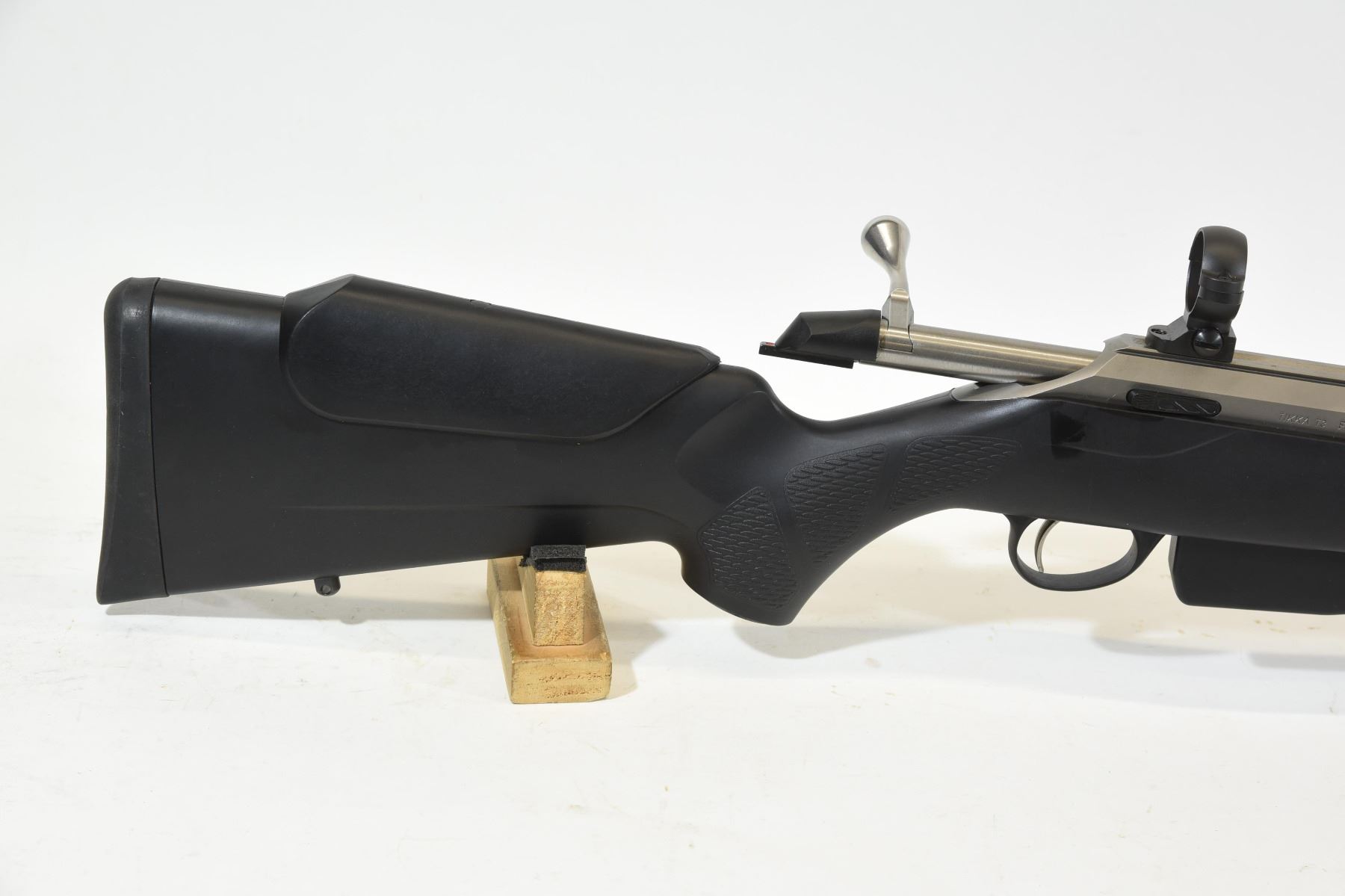 Non restricted, left handed, bolt action, .223 rem., 24" 1 in 8 twist heavy barrel, SN F49103, black synthetic stock in very good condition, stainless barrel and receiver in good condition, bore is excellent, comes with burris scope mounts and rings