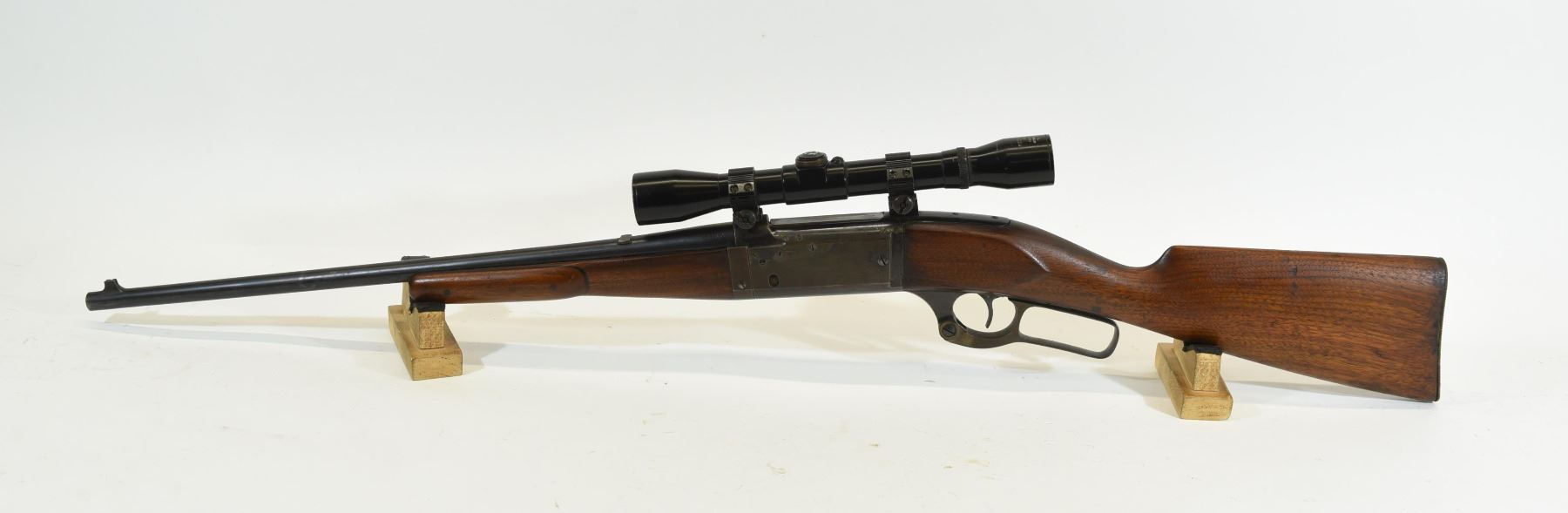 Non restricted, lever action, cal. 22 high power, 20" barrel, Wood has a crack in the butt stock under the lever and a crack on the left side behind the receiver, the fore stock has been modified, bluing on barrel has some surface rust and the receiver is turning brown, bore is good, missing part of front and rear sights, has a King's Way 4 x 32 scope
