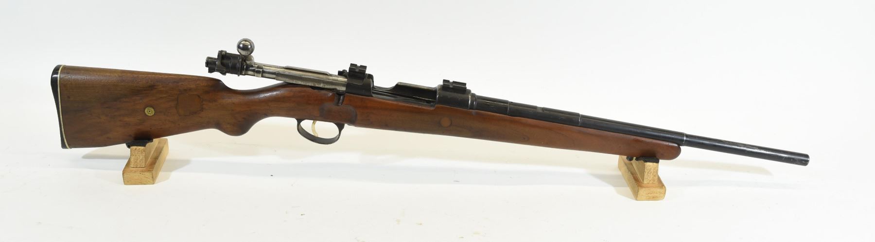 Non restricted, bolt action, 8 x 57 cal., 18 1/2" barrel, SN 6087, wood has a spot on both sides of butt stock that has been filled with possibly wood putty other than that wood is good, bluing is showing grey, bore has some light pitting, trigger has been painted whitw and it has a Marlin butt plate, has scope mounts but no sights