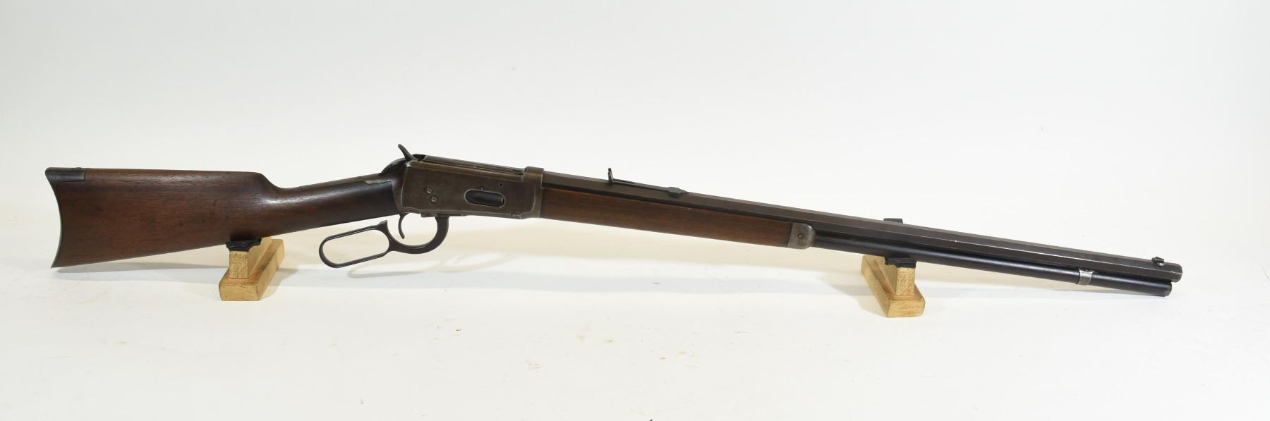 Non-restricted, lever action, 38-55 Win, 26" octagonal barrel, SN 170490. Wood has a few scratches, bluing is brown, bore pitted with a ring mark 12 inches from muzzle.
