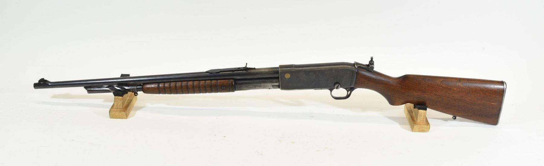 Non restricted, pump action, 32 rem., 22" barrel, SN C 66619, wood has handling marks and a few thin cracks in the butt stock behind the receiver and a thin crack in the fore end, bluing has handling marks and a bit of surface rust, bore is good