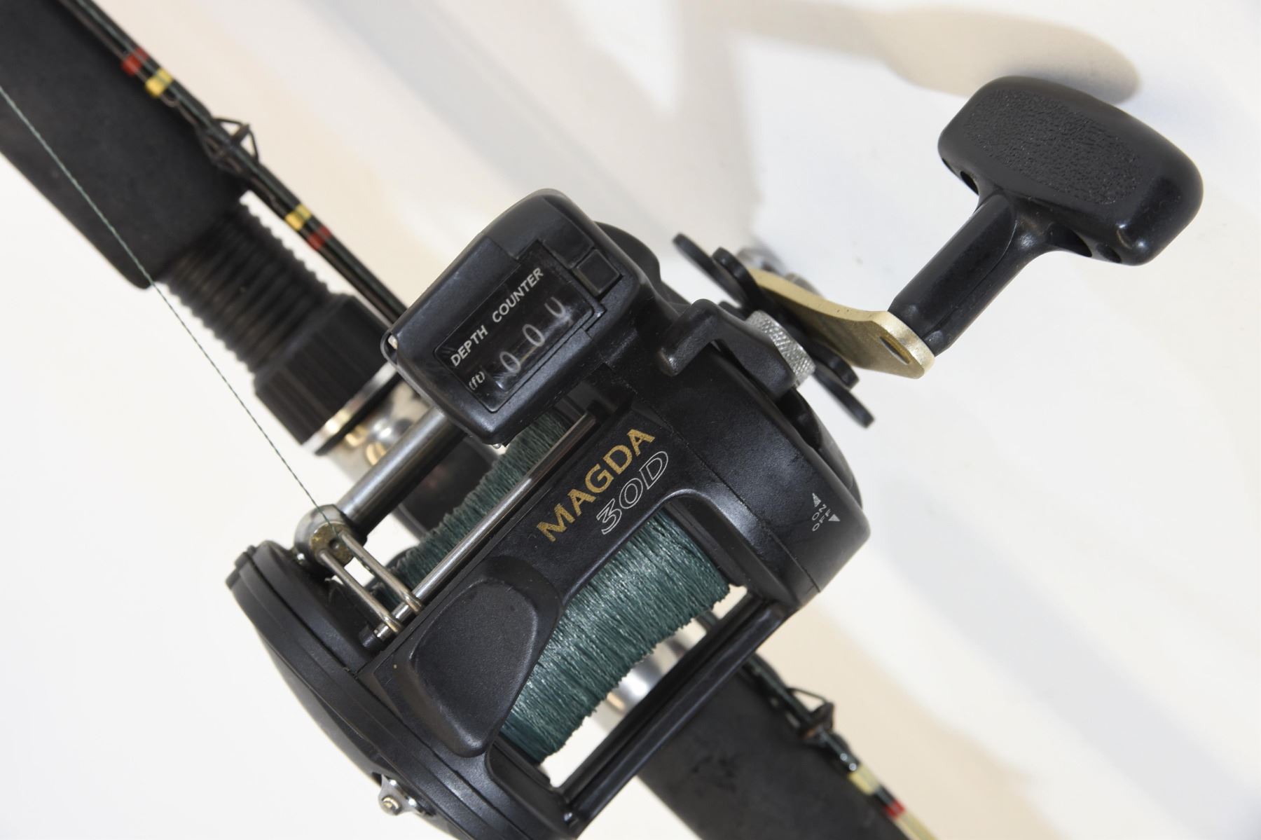 Quantum Magda 30D reel on a Zebco Rhino Glowtip pole, 9 foot,downrigger action, line wt. 10 - 25 lb., lure wt. 1/8 - 2 oz.