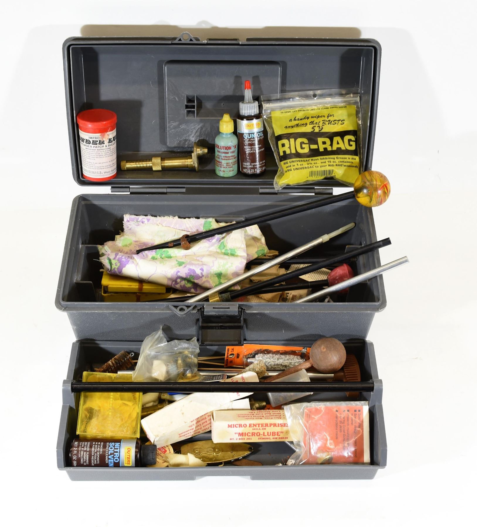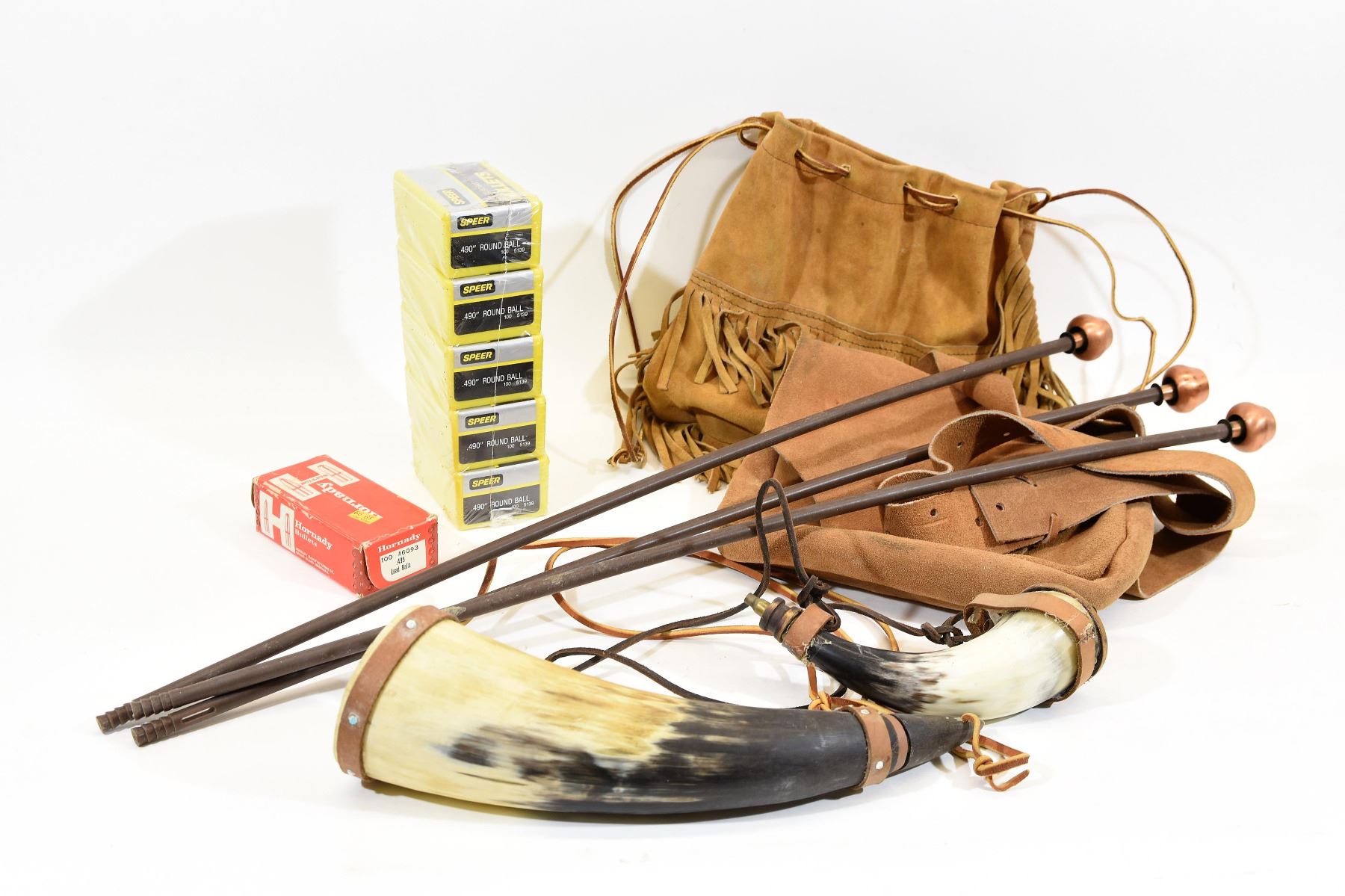 Tool box full of cleaning accessories, brushes, bullet starter, percussion caps and much more, 500 pcs of .490 round ball, 100 pcs .495 round ball, micro lube, 3 plastic cleaning rods, one large and one small powder horns and two leather pouches