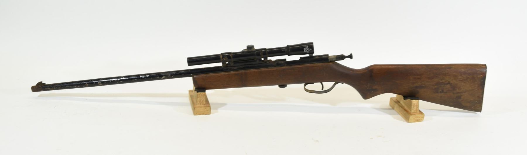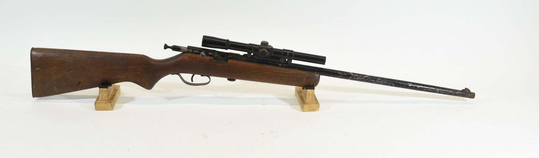 Non-restricted, single shot, 22LR, 22" barrel, SN none. Wood has a gouge and several deep dents, bluing has heavy pitting, bore excellent. Comes with 4 x 15 scope.