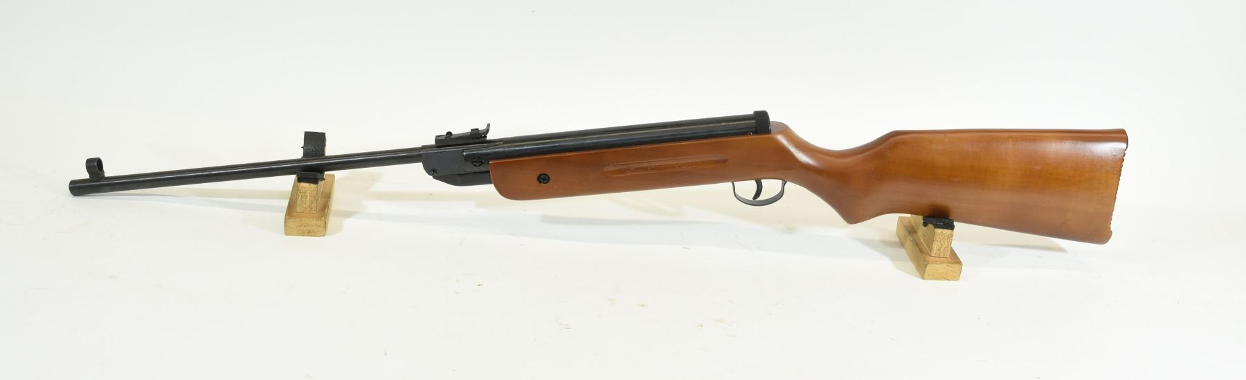 Under 500 FPS, single shot, 177 pellet, 15 1/2" barrel, SN none. Wood has a couple minor marks, bluing has some marks, bore excellent. Test fired OK with one pellet.