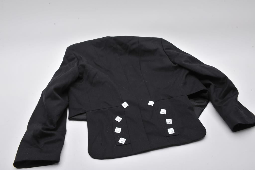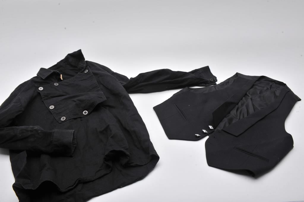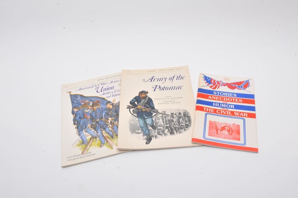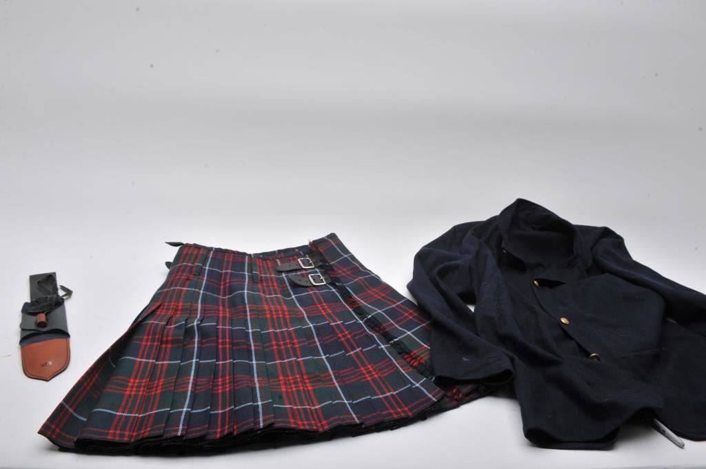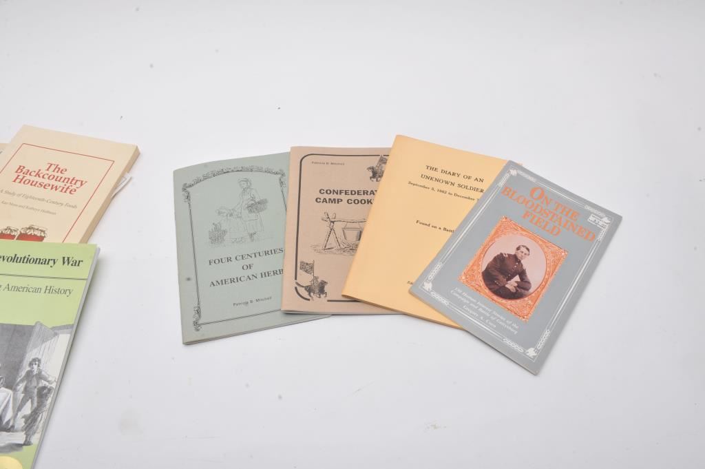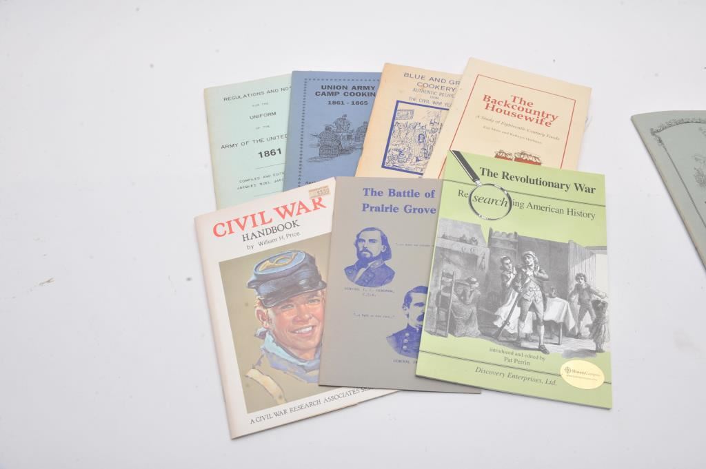 A bonanza lot of re-enactor uniforms, kilts, shirts, hats and books. The lot includes a replica Civil War Hardee hat, Confederate style Kepi, waist coats, trousers, jackets, and belts of wool, cotton and tweed fabrics. Additionally, there are approximately 16 books on the Civil War, Revolutionary War and other topics. Est.: $200-$400.