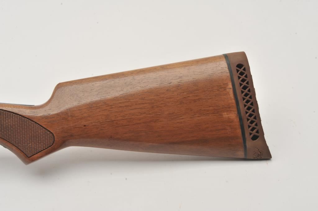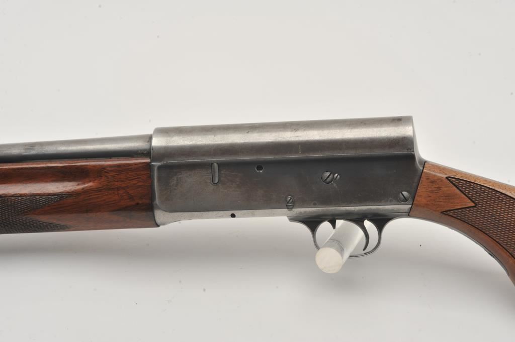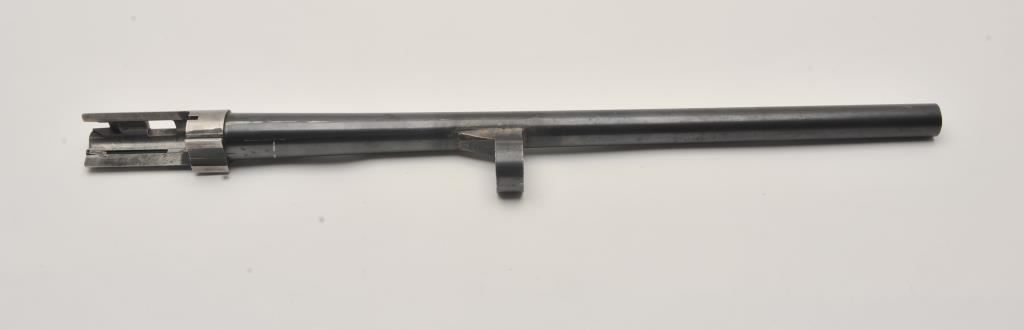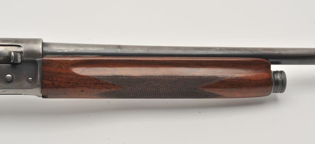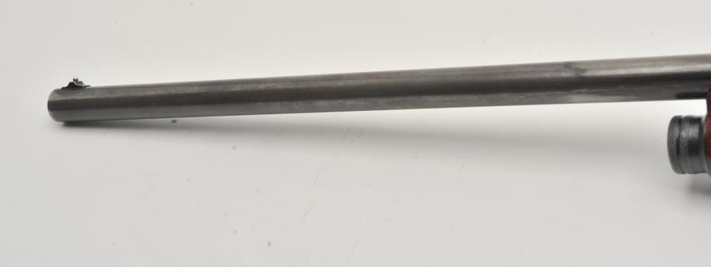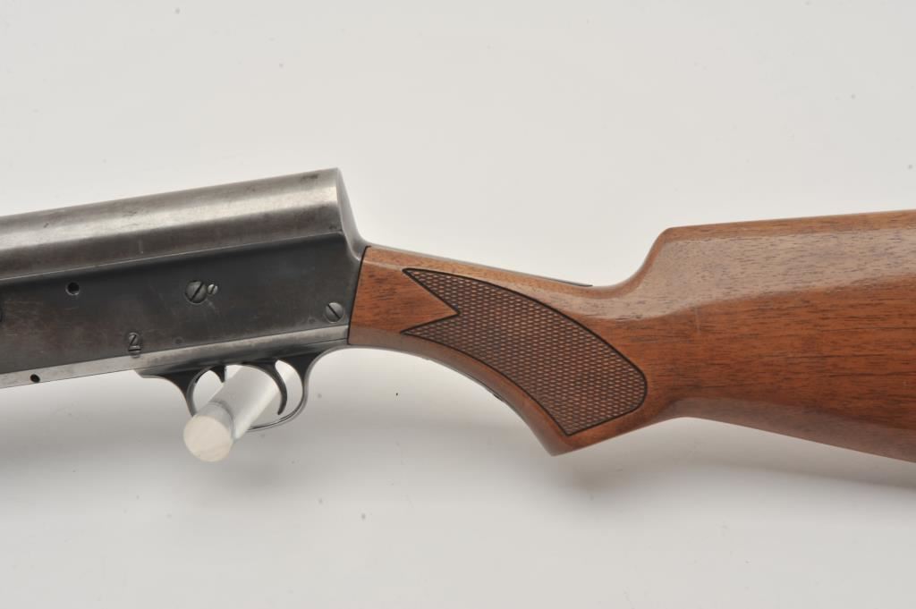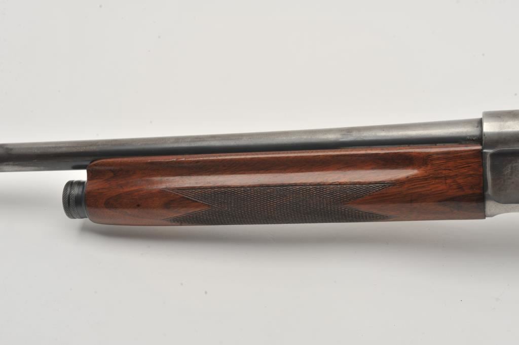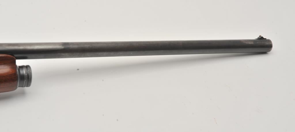 Remington Model 11 semi-automatic shotgun, 12 gauge, Serial #172503. The shotgun is in good overall condition with a 28” barrel with a steel bead front sight. The metal surfaces are a mix of thinning blue and grey patina. The checkered wood stocks are in good condition with a replacement butt stock. The butt ends with a ventilated rubber pad providing a 15” LOP. The bore is fair, the action functions and markings are crisp. The lot includes an additional 18” barrel in good overall condition. Est.: $150-$300. (C+R).