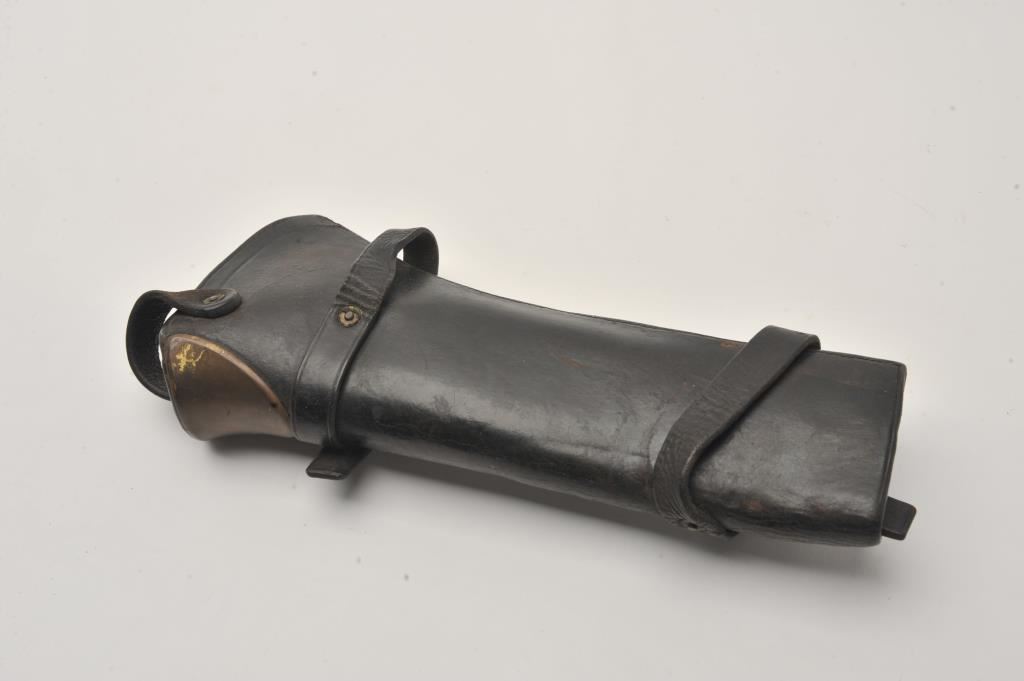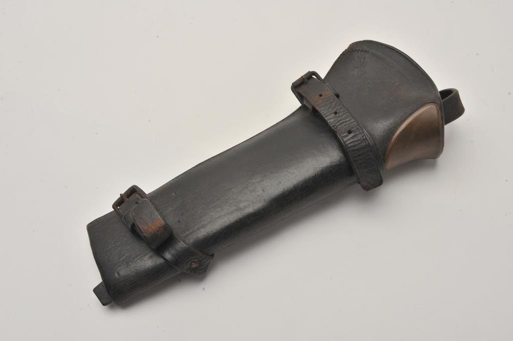 Rock Island Arsenal-marked leather U.S. carbine saddle boot with straps in overall good condition; also stamped “D/26”. Est.: $100-$200.