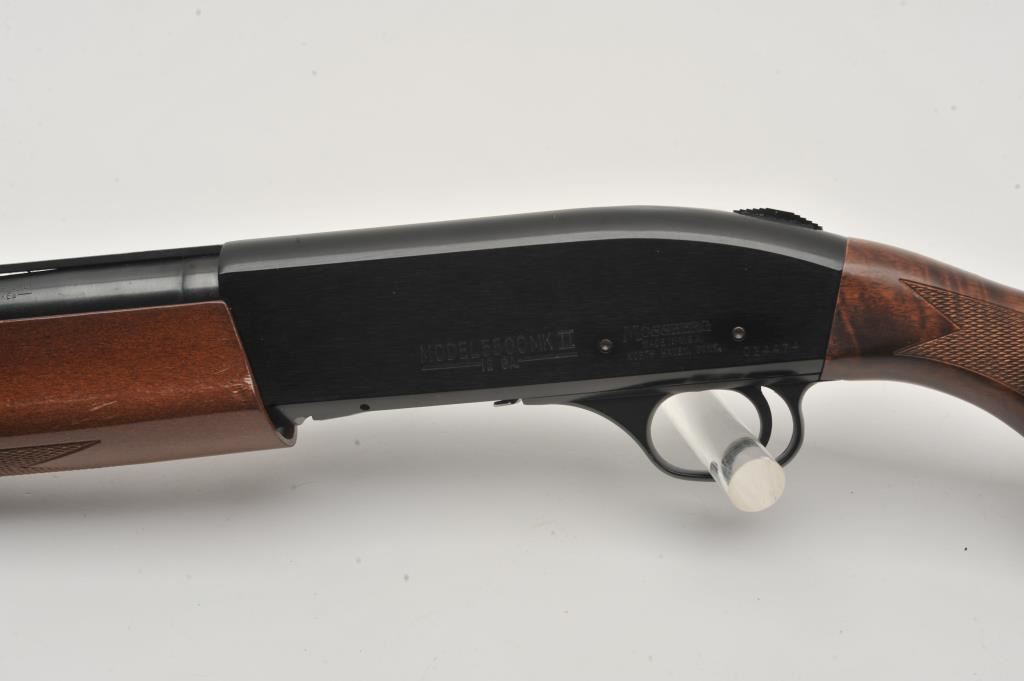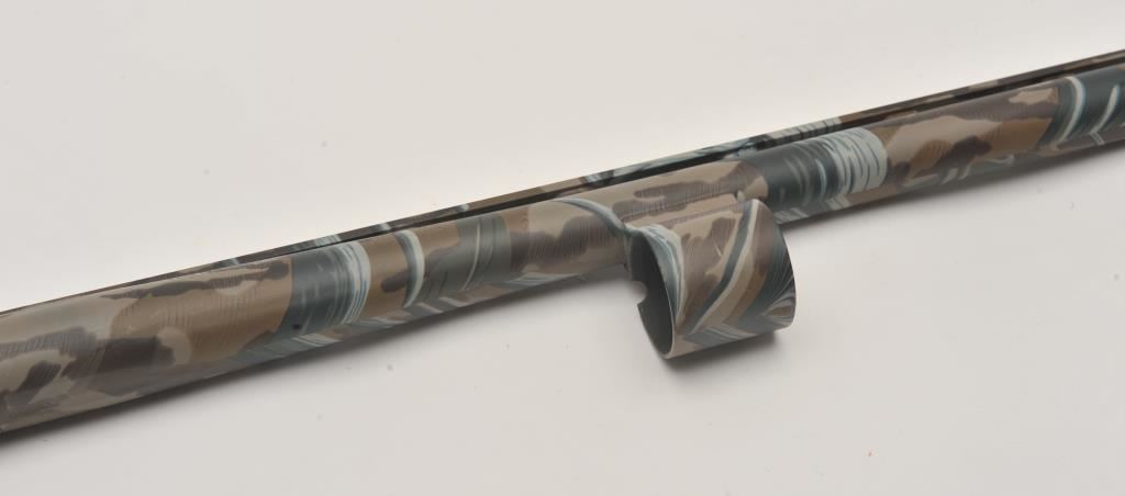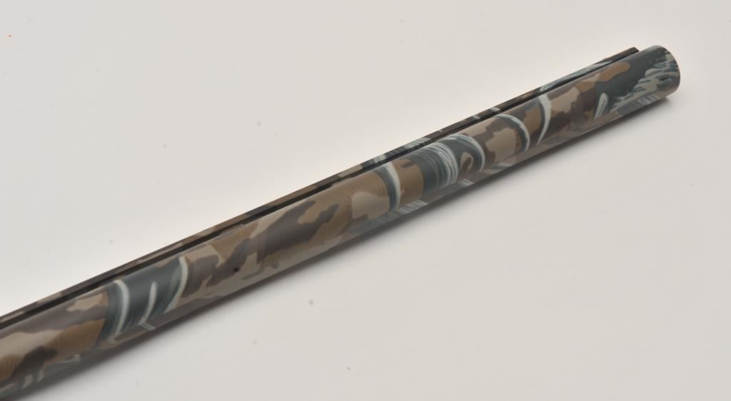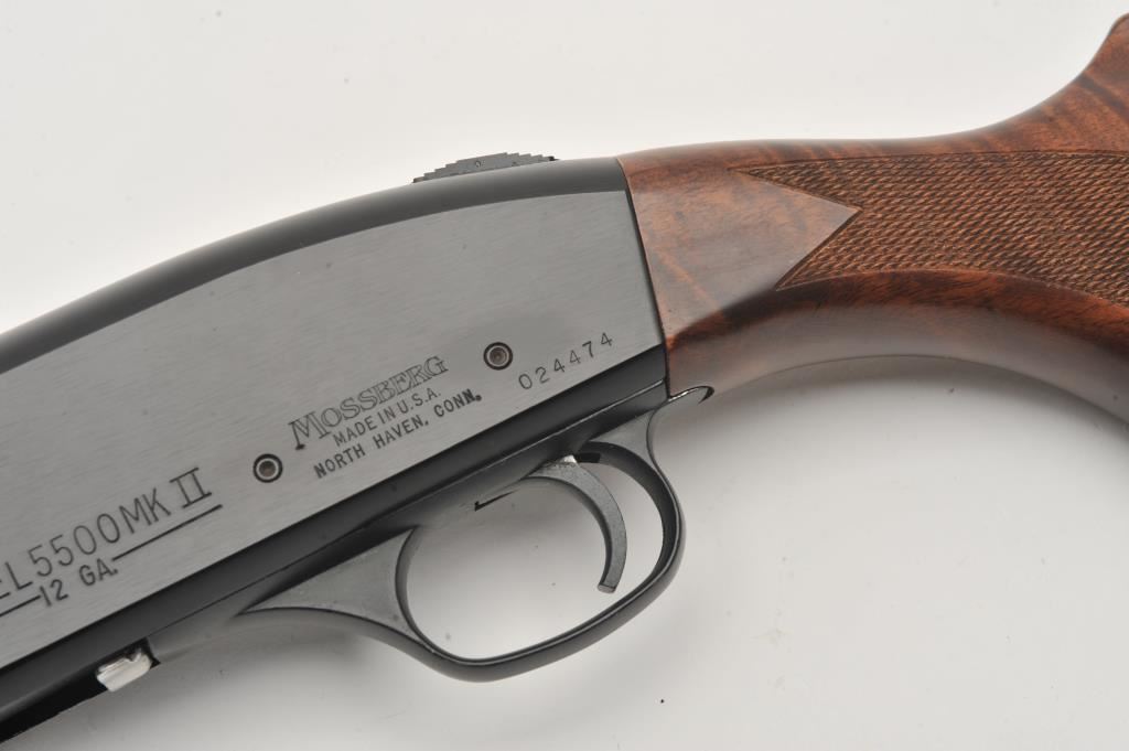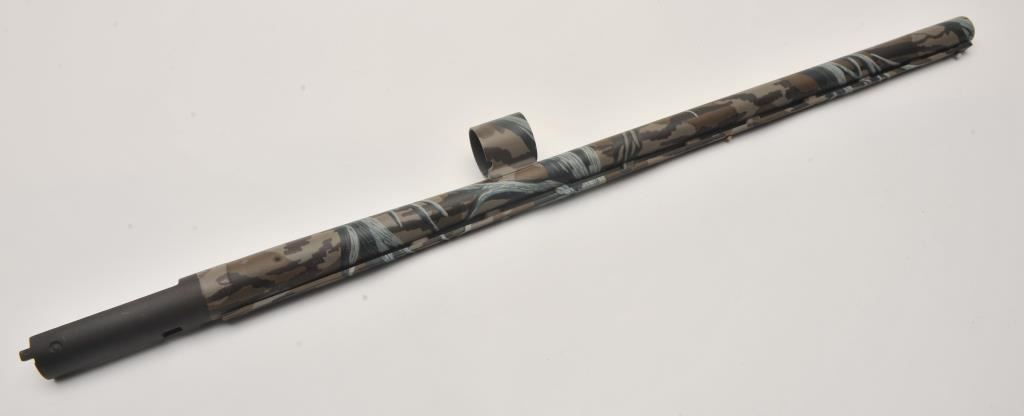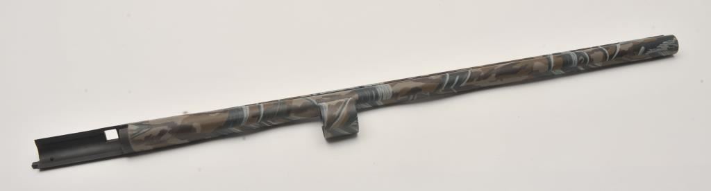 Mossberg Model 5500 MK II semi-automatic shotgun, 12 gauge, Serial #024474. The shotgun is in very good overall condition with a 26” barrel with a full-length ventilated rib and brass bead front sight. The metal surfaces retain nearly all of their blue finish with light wear at the muzzle and edge wear on the receiver. The checkered wood stocks are in very good condition with nice figure in the butt stock. The butt stock has been shortened and a ventilated rubber recoil pad added providing a 13 ¼” LOP. The bore is good, the action is crisp and markings are sharp on this lightly used Mossberg. The lot includes an additional 24” barrel finished in camouflage with a full-length ventilated rib. Est.: $200-$400. (Modern).