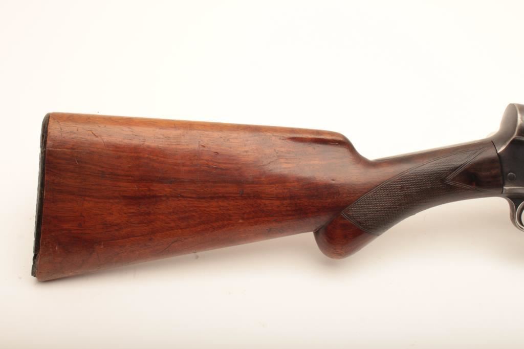 FN Browning patent Auto 5, #78350J, 16 Ga, 27" solid rib barrel with Poly choke, blued finish, checkered walnut stock with original butt plate. Shotgun is in good condition overall, showing the majority of it's original finish, bore is very good, action is good. Stock is good, small chips and cracks in the forend, minor chips out of the toe in the butt plate. (C&R) Est. $250-500