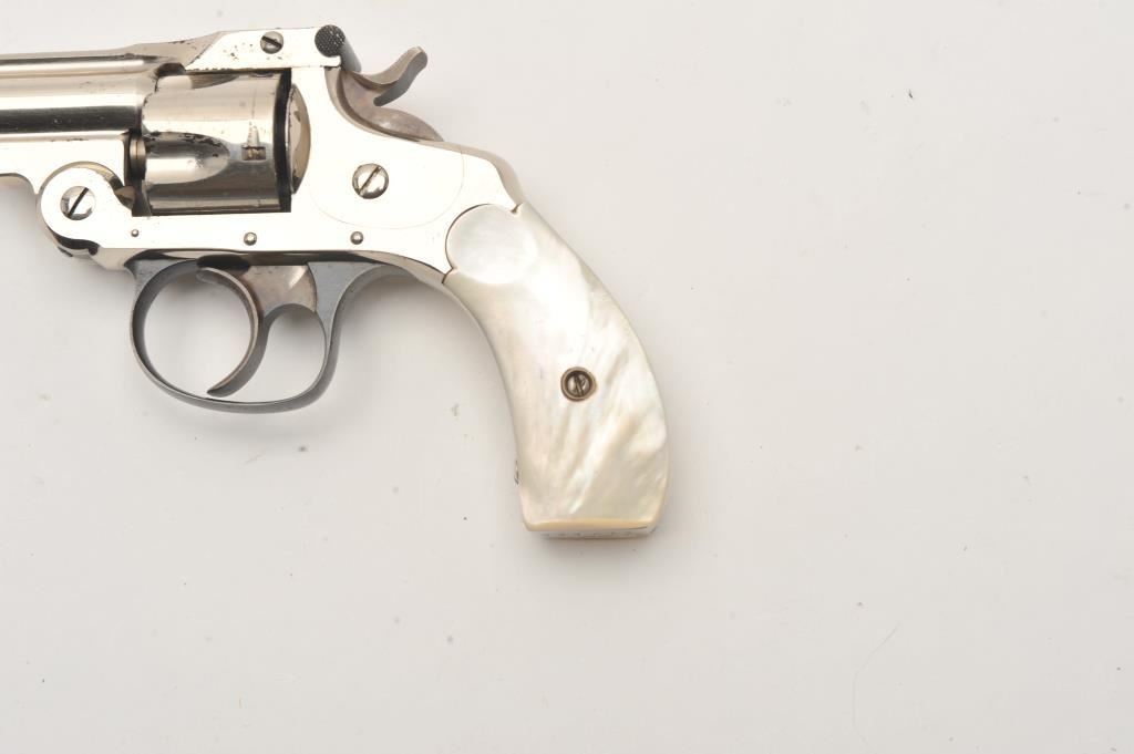 Smith & Wesson 2nd model DA revolver, #217485, .32 cal., factory nickel with pearl grips. 95-98% overall with bright blue and case hardening on small parts, grips are excellent. Interior excellent. Some scratching on left front of frame. In later New Departure box. (C&R) Est. $300-600