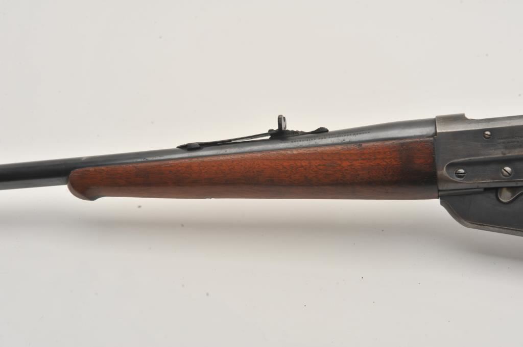 Winchester Model 1895 lever action rifle, .30 U.S. caliber, Serial #59436. The rifle is in fine overall condition with a 28” round barrel with a silver blade front and standard rear sights. The barrel retains nearly all of its toning blue finish with muzzle wear and lights scratches. The receiver retains the majority of its blue finish with high point edge wear evident. The smooth wood stock is in good condition with mars and compressions consistent with carry and use. The butt ends with a smooth, steel crescent butt plate. The bore is fair, the action is crisp and markings are sharp on this desirable Winchester. Est.: $600-$1,200. (C+R).