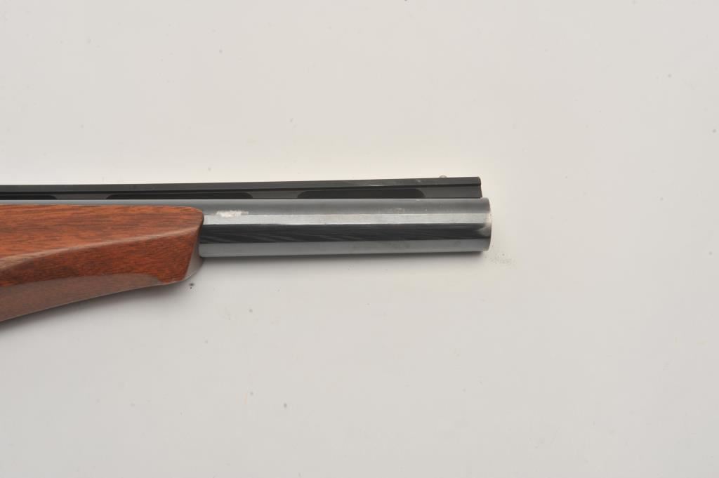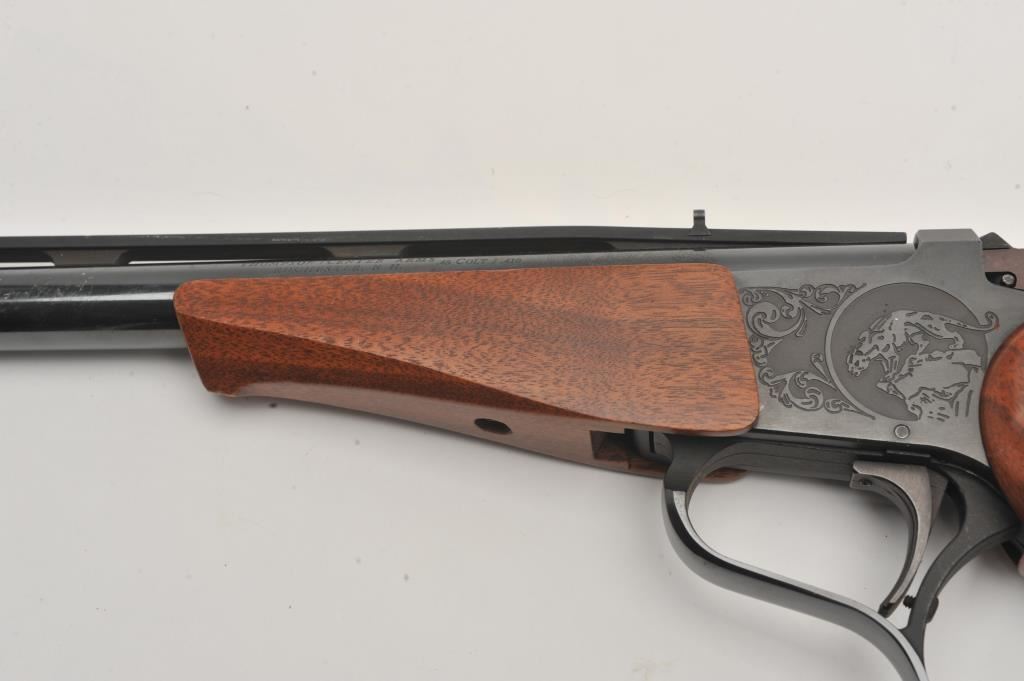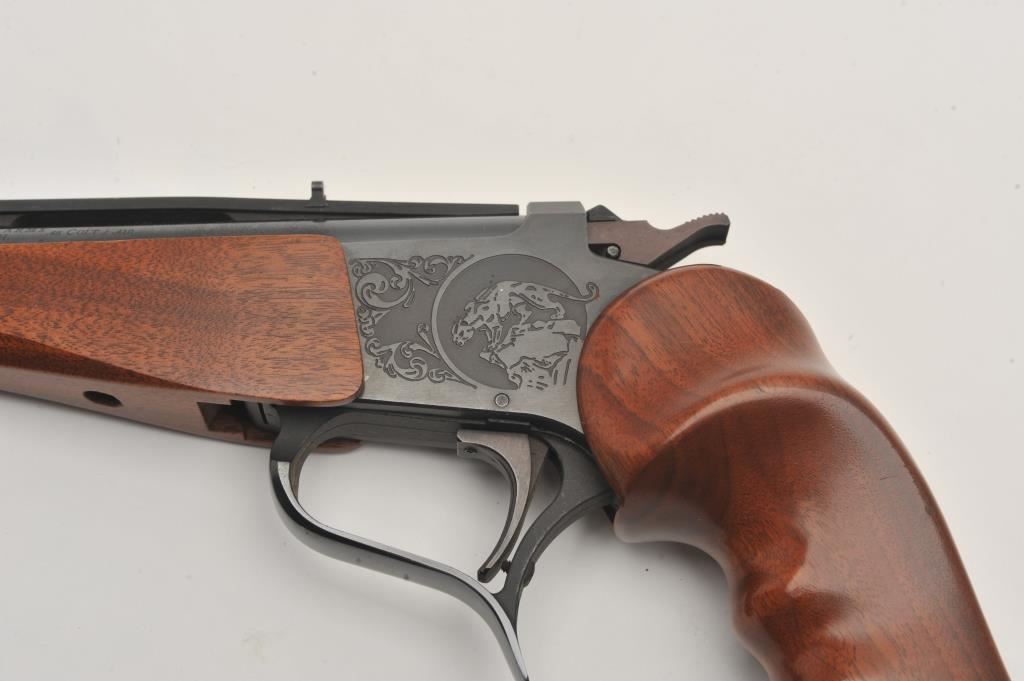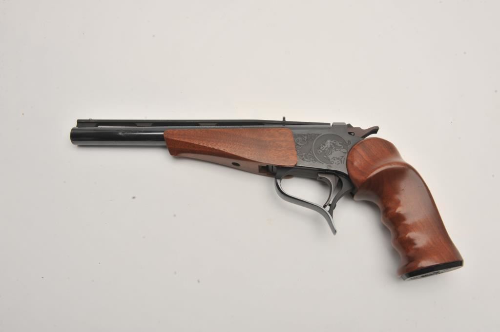 Thompson Center Arms single shot pistol, .45 Colt caliber, Serial #331793. The pistol is in very good overall condition with a 10” barrel with a full-length ventilated rib. The metal surfaces retain the majority of their blue finish with light scratches and loss of finish on the barrel. The smooth wood grips and fore end are in very good condition with light handling marks. The lot also includes two additional Thompson Center 10” barrels in .22 Hornet and .22 Long Rifle calibers. Both barrels are in very good condition with very good bores. The lot includes a TC marked leather satchel case carrying the pistol and extra barrels. Est.: $400-$800. (Modern).