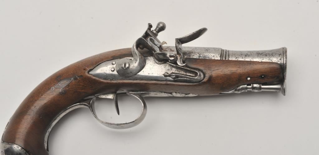 Italian blunderbuss small flintlock pistol, approximately .60 caliber, 3.25” barrel, 7.5” overall, grey patina, un-marked, wood stock; overall good condition with some scattered spots of light pitting, surface rust in pan, crisp action, good wood stock. (Antique). Est.: $400-$800.