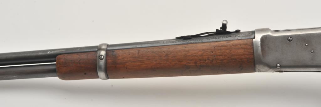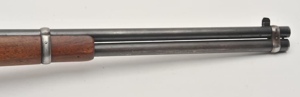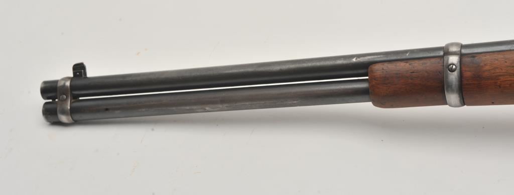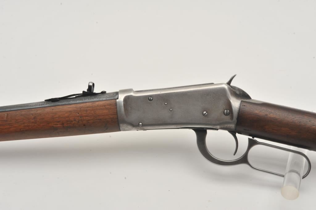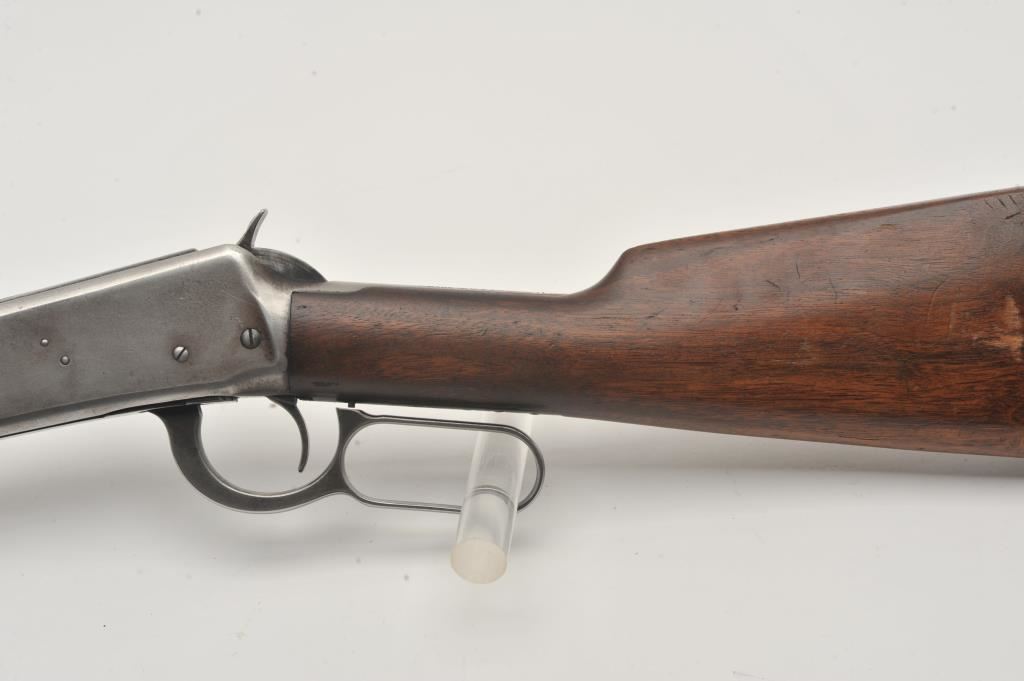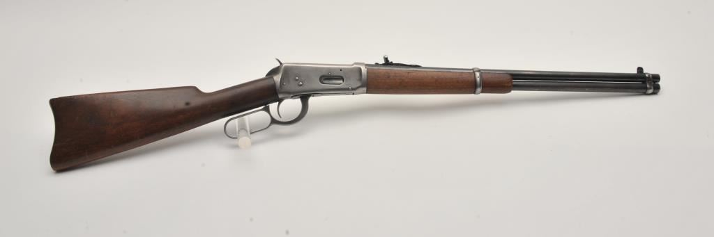 Winchester Model 94 lever action rifle, .32 Winchester Special caliber, Serial #1078110. The rifle is in good overall condition with a 20” barrel with a blade front and “KING” rear sights. The barrel and full-length magazine retain a significant amount of thinning blue finish mixing with grey patina. The receiver is a silver patina with muted blue still visible on the bolt, the loading gate and in the protected areas. The smooth wood stocks are in good condition with mars and dents consistent with carry and use. The butt ends with a smooth steel crescent butt plate. The bore is good, the action crisp and markings are sharp. Est.: $500-$1,000. (C+R).