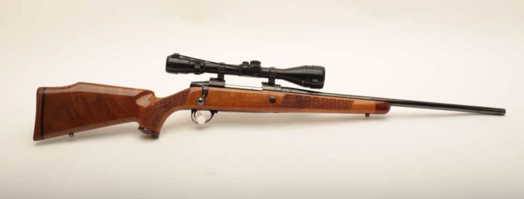 Sako AV bolt action rifle, 7mm Rem. Mag. caliber, 22.5” barrel, blued finish, checkered wood stock, S/N 588737, mounted with a Shepherd scope displaying crisp optics; gun is overall fine condition with fine bore, action, markings and stock. (Modern). Est.: $600-$1,200.
