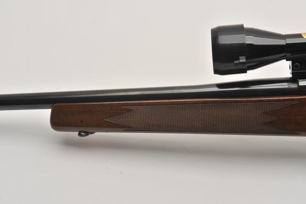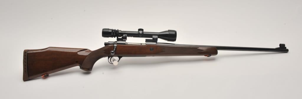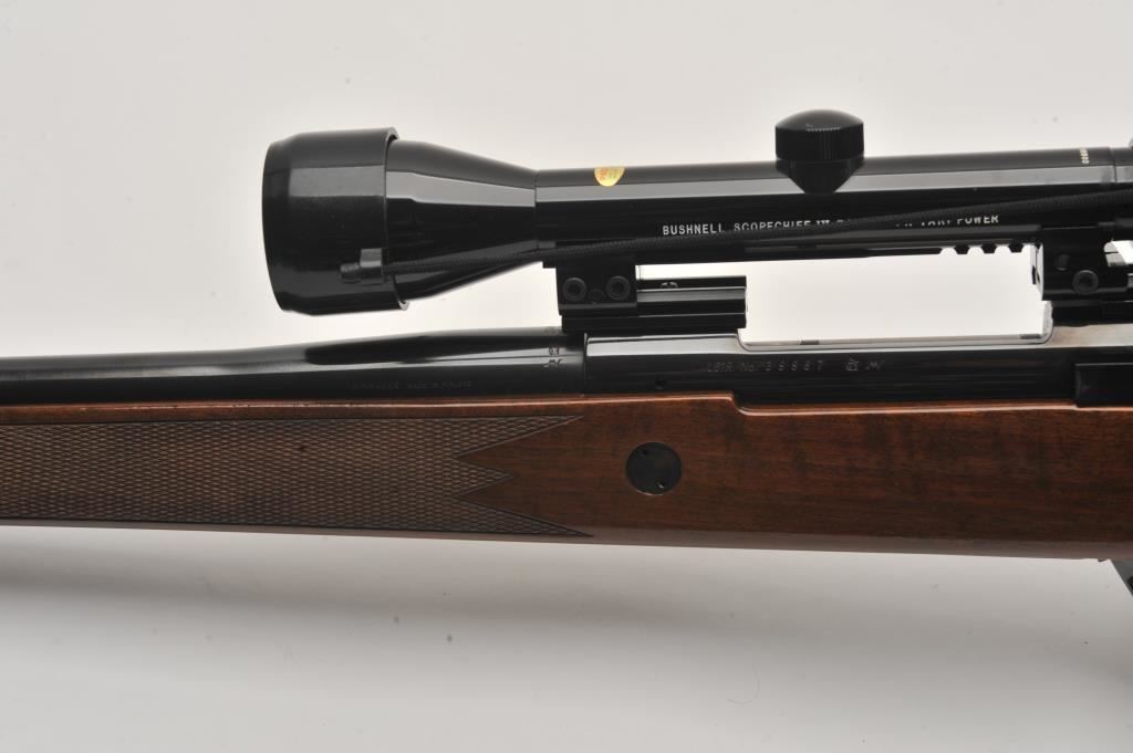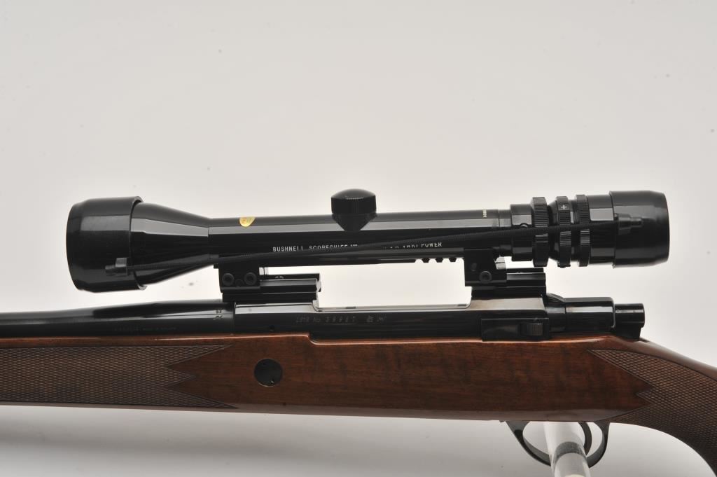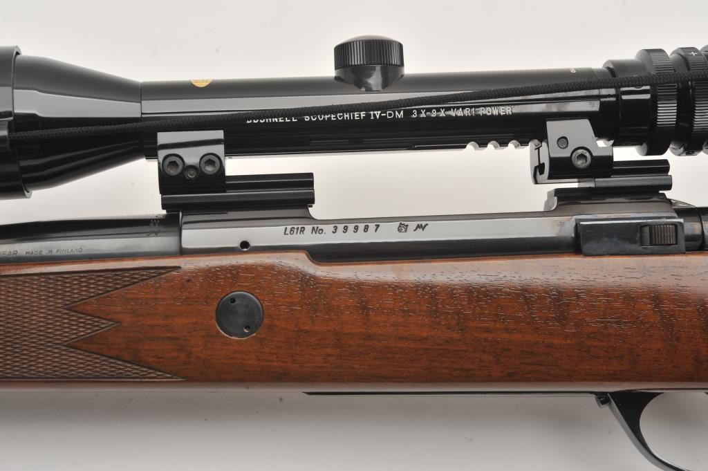 Sako Finnbear bolt action rifle, .30/06 caliber, Serial #39987. The rifle is in fine overall condition with a 24” barrel showing little use. The metal surfaces retain nearly all of their blue finish with only light handling marks. The barrel is marked, “MADE IN FINLAND” while the receiver is marked L61R. The finely checkered wood stock is in very good condition with sharp checkering and light storage marks. The butt stock ends with a Sako marked ventilated rubber recoil pad. The rifle is topped with a Bushnell Scope Chief IV-DM 3 x 9 variable power scope with clear crisp optics. The bore is good, the markings are sharp and the action is crisp on this lightly used Sako. Est.: $600-$1,200. (Modern).