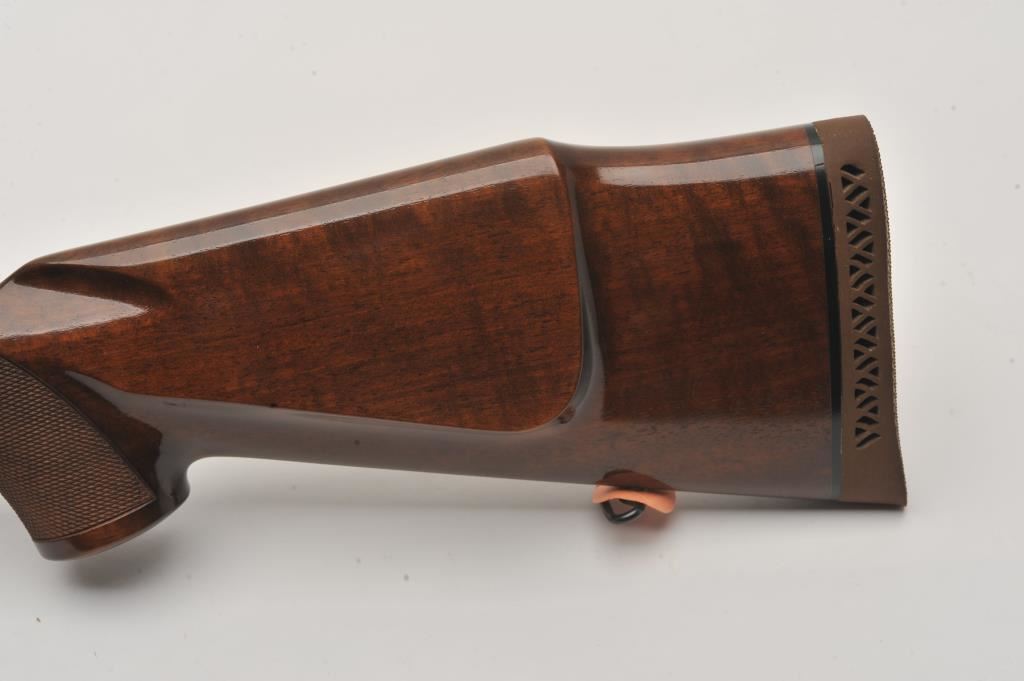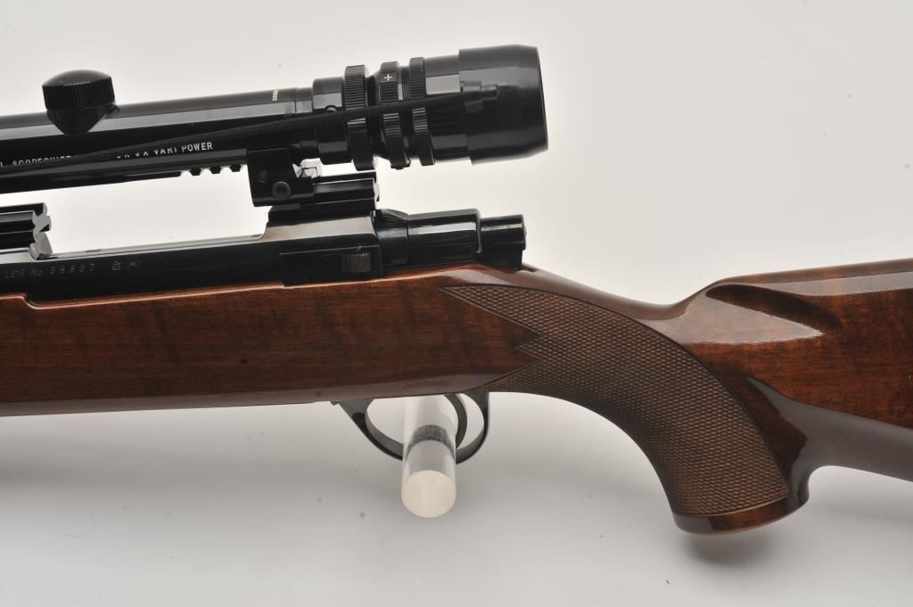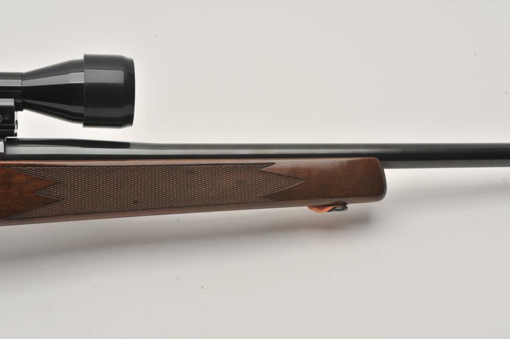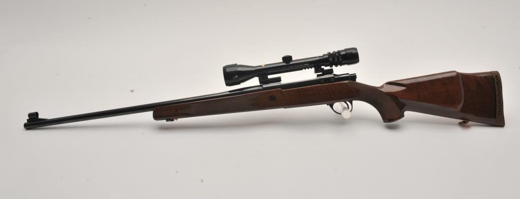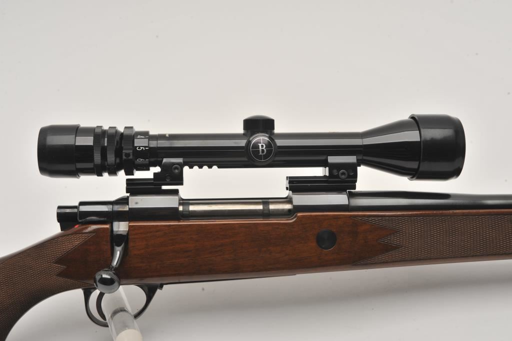 Sako Finnbear bolt action rifle, .30/06 caliber, Serial #39987. The rifle is in fine overall condition with a 24” barrel showing little use. The metal surfaces retain nearly all of their blue finish with only light handling marks. The barrel is marked, “MADE IN FINLAND” while the receiver is marked L61R. The finely checkered wood stock is in very good condition with sharp checkering and light storage marks. The butt stock ends with a Sako marked ventilated rubber recoil pad. The rifle is topped with a Bushnell Scope Chief IV-DM 3 x 9 variable power scope with clear crisp optics. The bore is good, the markings are sharp and the action is crisp on this lightly used Sako. Est.: $600-$1,200. (Modern).