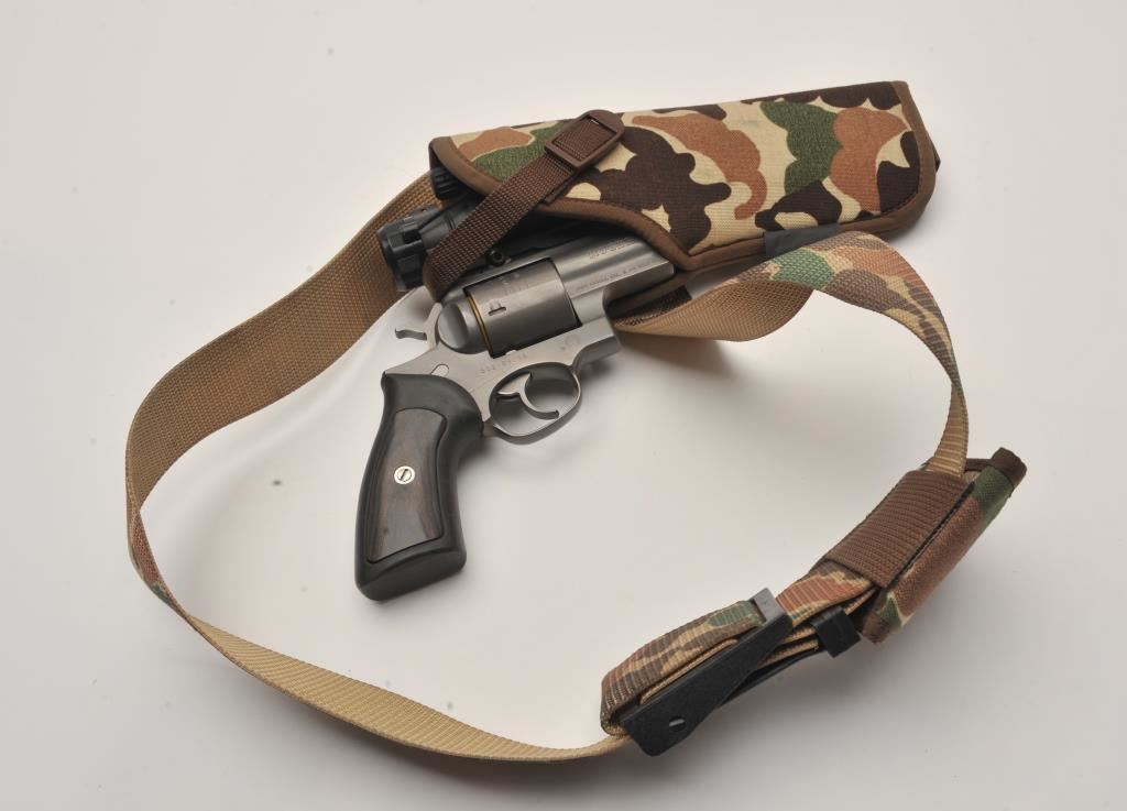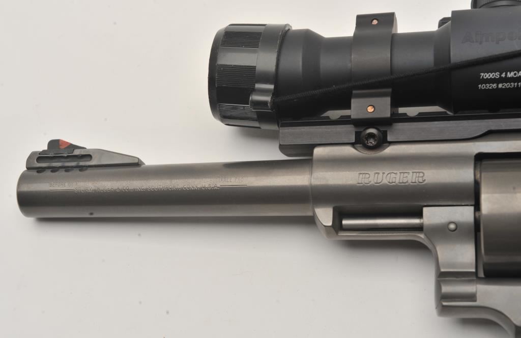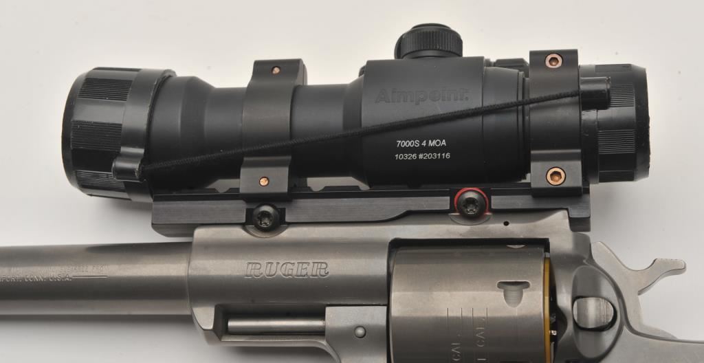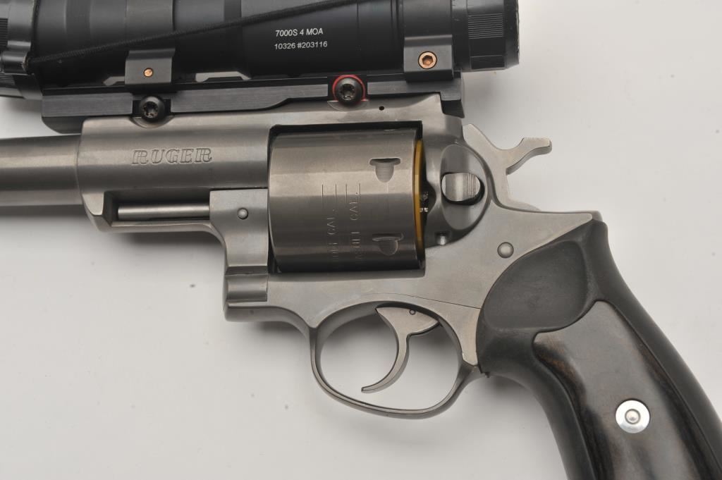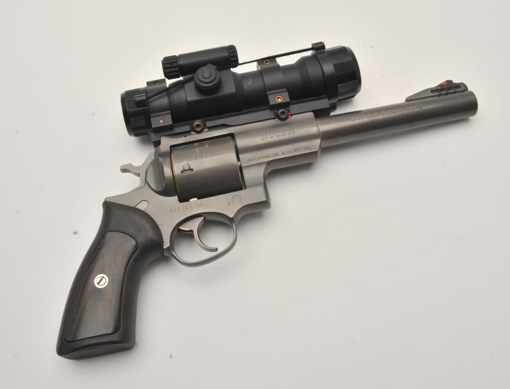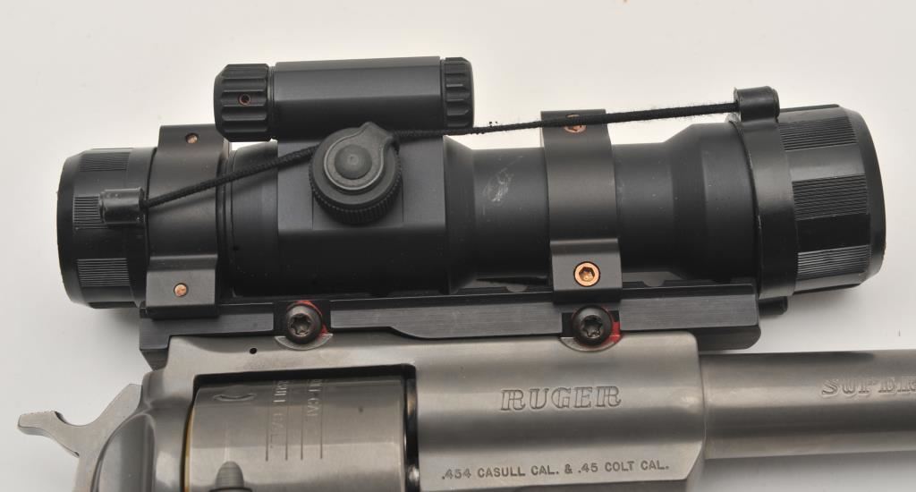 Ruger Super Redhawk double action revolver, .454 Casull caliber, Serial #552-09254. The pistol is in very good overall condition with a 7 ½” ported barrel with a red ramp front sight. The metal surfaces retain the majority of the matte grey finish with a slight drag line on the cylinder. The laminate wood and rubber grips are in very good condition with handling marks only. The pistol is topped with an Aimpoint 7000 Reflex Optical Red Dot sight. The bore is dirty but should clean to good, the action is crisp and markings are sharp. The lot also includes an Uncle Mike’s camo nylon belt and holster. Est.: $500-$1,000. (Modern/PPT).