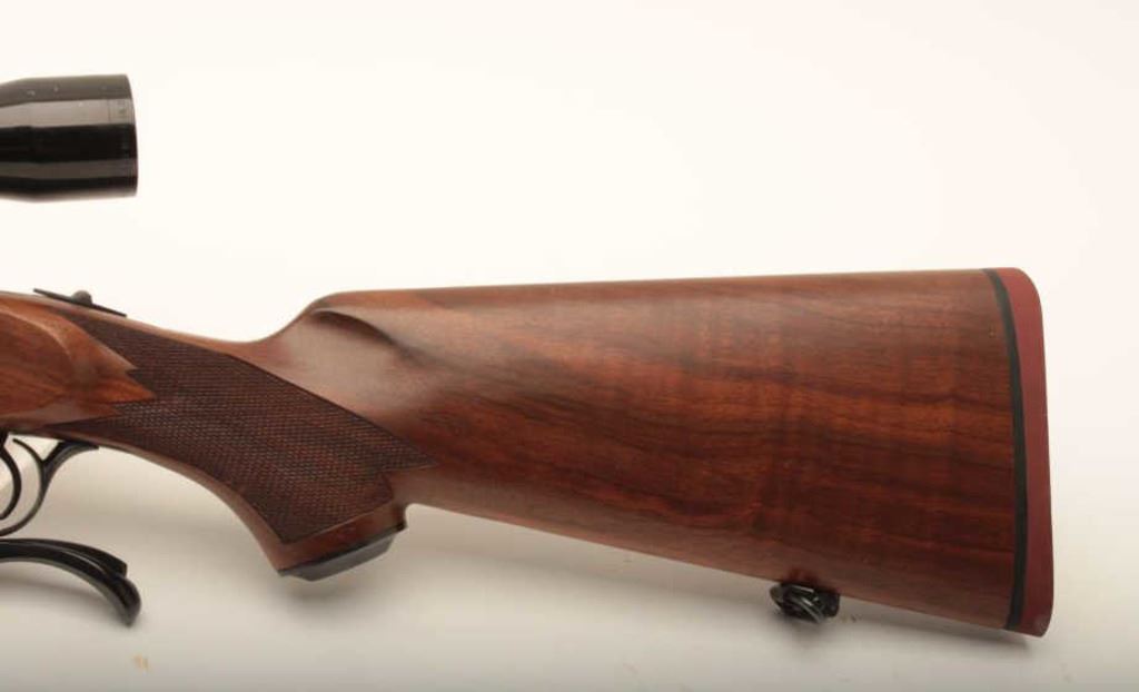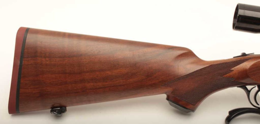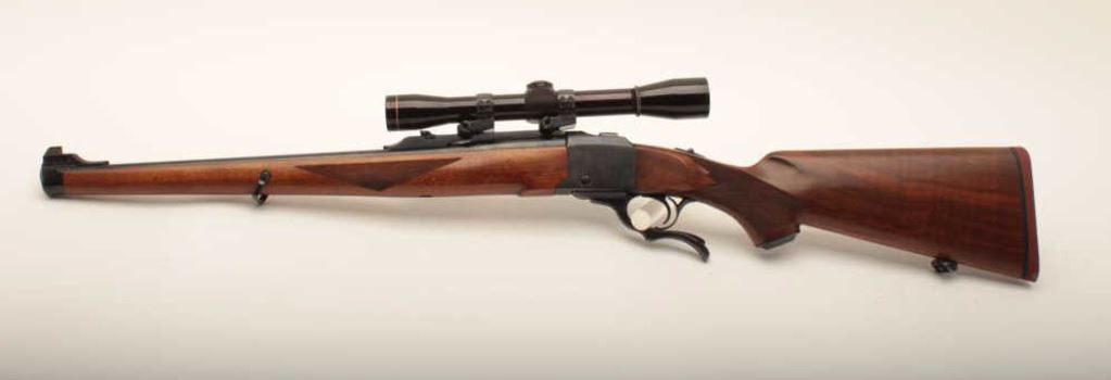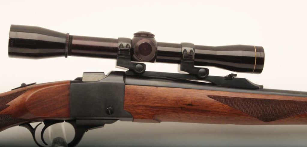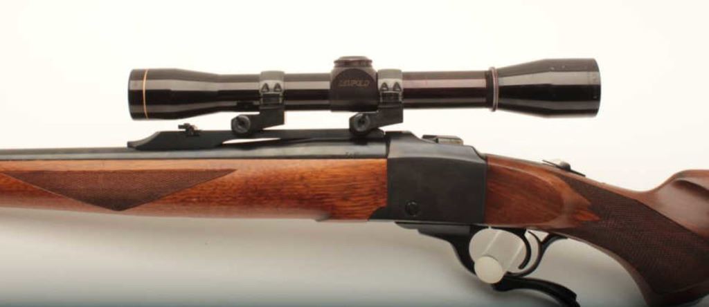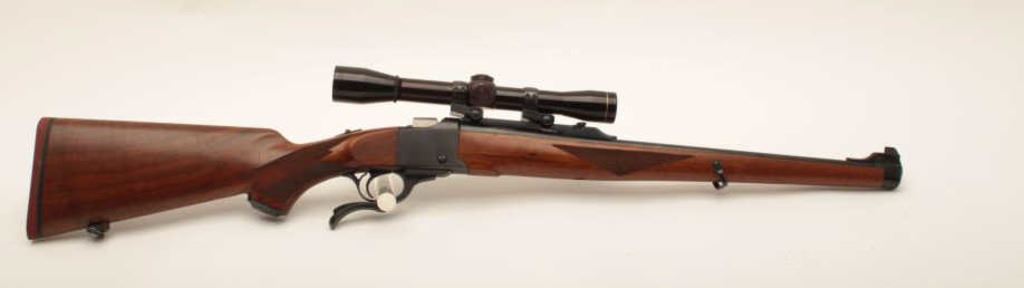 Ruger No.1 single shot rifle, 7 x 57 caliber, Serial #131-46869. The rifle is in fine overall condition with a 20” barrel with a ramped blade front and folding rear sights. The metal surfaces retain nearly all of their blue finish with light handling marks. The checkered wood full-length Mannlicher style stock is in very good condition. The butt stock ends with a red, Ruger marked rubber recoil pad. The rifle is topped with a Leupold M8 4X fixed power rifle scope with clear, crisp optics. The bore is good, the action is crisp and markings are sharp on this desirable, early No. 1. Est.: $600-$1,200. (Modern).