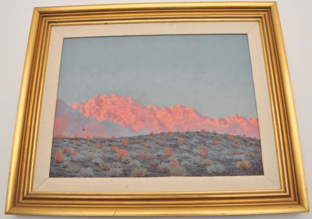 Painting entitled, “Reflected Sunrise” by John Hilton. The work is 12” x 16” and is signed in the lower right corner and in marking pen on the back with Mr. Hilton’s personal handwriting and title of his work. Acquired in the 1970’s-1980’s from Mr. Richard DeLucca at the Saddleback Galleries, on First Street in Santa Ana, California. The consignor was informed at the time of purchase, the work was originally acquired from Joan Irvine Smith, a long-time client of Mr. DeLucca. The painting is nicely framed and matted in good overall condition. Est.: $600-$1,200.