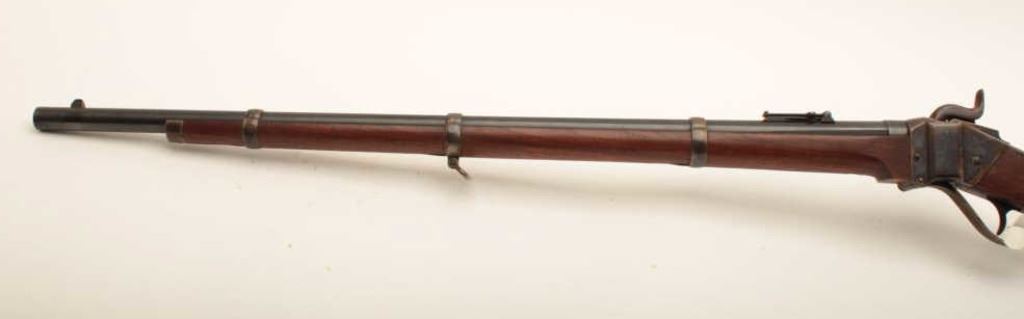 Shiloh Sharps reproduction of a Sharps New Model 1863 single shot percussion musket, .50 caliber blackpowder only, 30” barrel, blued and case hardened finish, wood stocks, iron patchbox, sling swivels, S/N 1116; overall fine condition with majority of blued and case color finish remaining, fine bore, action, markings and stocks. (percussion). Est.: $400-$800.