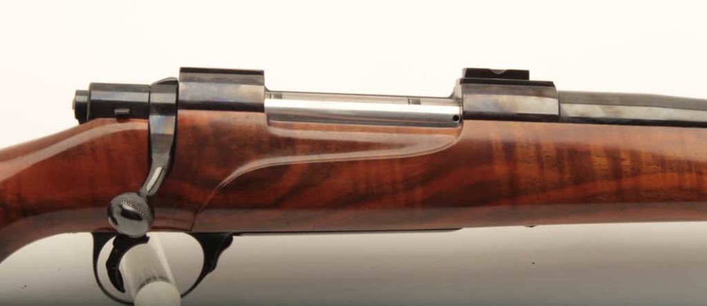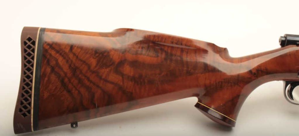 Sako L61R bolt action rifle with Jarvis 28” bull barrel and muzzle break, 7mm Rem. Mag. caliber, scope mounts, beautifully grained wood stock with XXXXX Pachmayr rubber butt pad, S/N 15738; overall very good to fine condition as customized; fine bore, crisp action, sharp markings, very good to fine deluxe wood stock. (Modern). Est.: $400-$800.