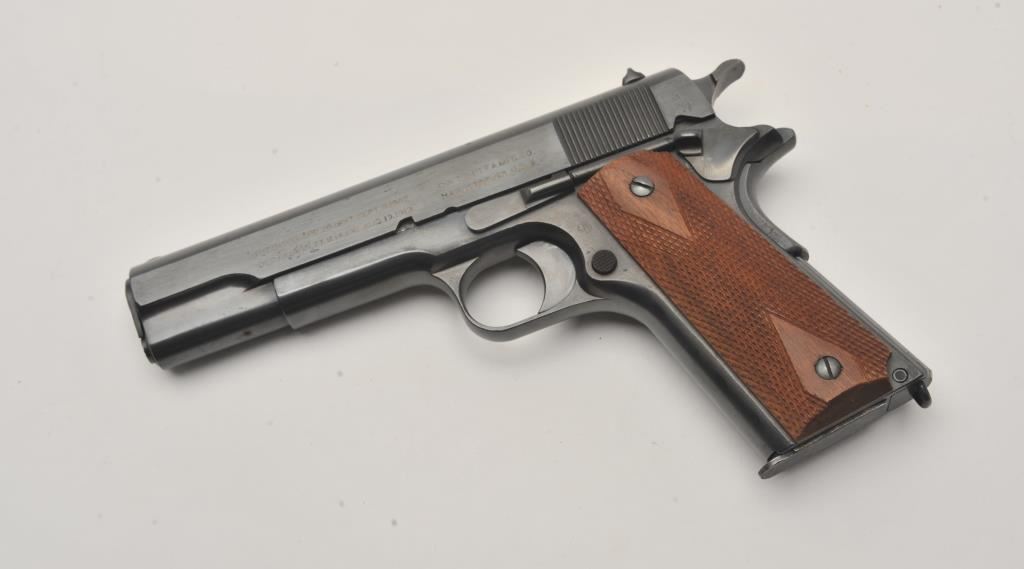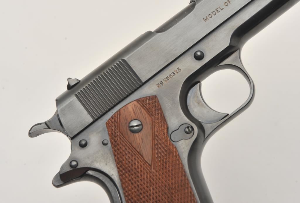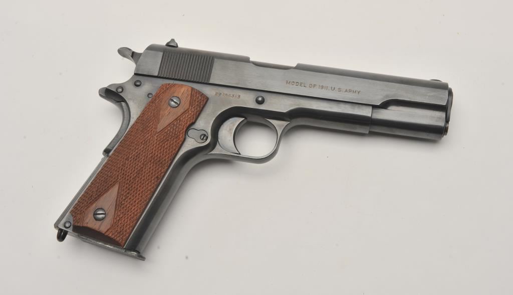 Colt Model of 1911, U.S. Army semi-automatic pistol, .45 ACP caliber, Serial #255323. The pistol is in fine overall condition as re-finished with a 5” barrel. The metal surfaces retain nearly all of their blue finish with light handling marks. The checkered wood grips are in very good condition with sharp checkering. The lot includes one correct, two-tone magazine. The bore is good, the markings are sharp and action is crisp. Est.: $750-$1,500. (C+R/PPT).