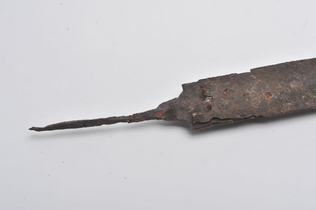 River find Medieval broadsword in scabbard. No hilt or pommel. Eric Vaule estate. 36" length x 2 1/4" at the widest part. Could have been headed for the Crusades. Est. $500-1000