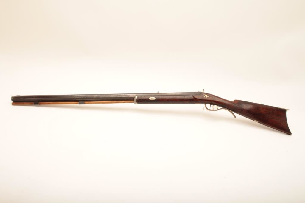 John Wurfflein (Philadelphia) percussion half stock plains rifle, approx. .48 caliber, 34” heavy octagon barrel, brown patina, double set triggers (working at time of description), single key checkered wood stock; overall good condition with good stock showing old re-varnish, crisp action, sharp markings on barrel. (Antique). Est.: $700-$1,400.