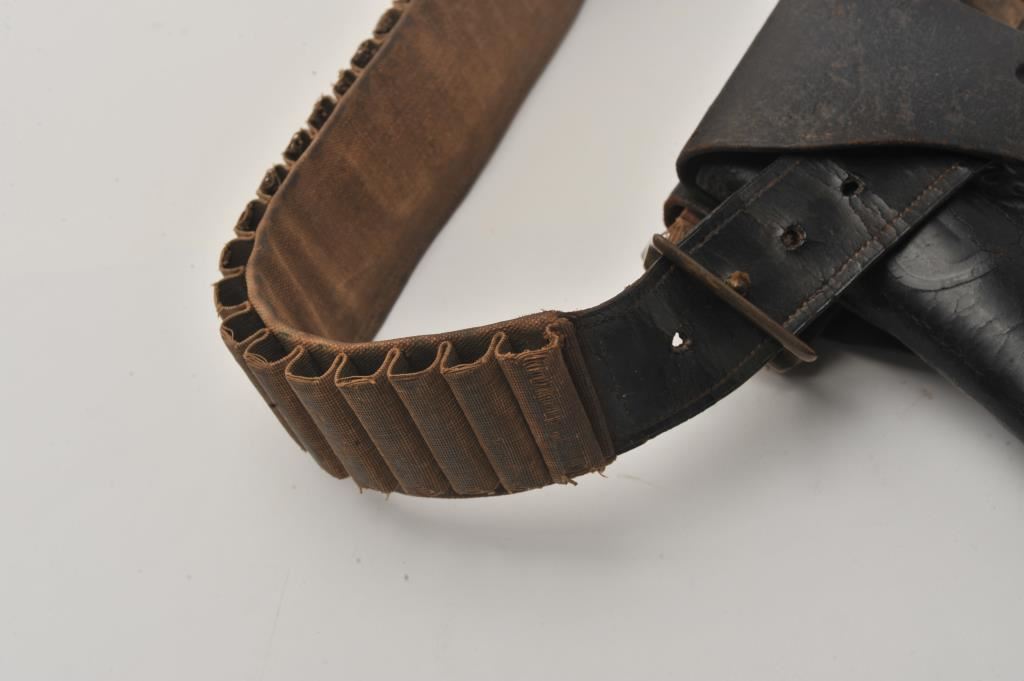 U.S. leather flap holster with two position flap (for Colt SAA or S&W Schofield revolver) with cartridge belt in overall fair to good condition; belt is marked “Watervliet Arsenal”. Est.: $700-$1,400.