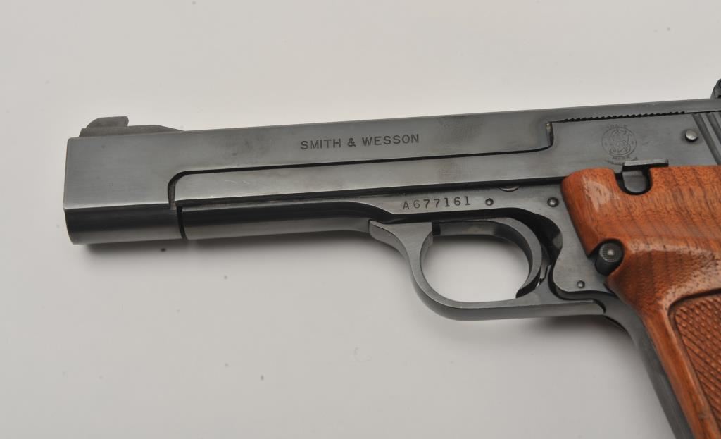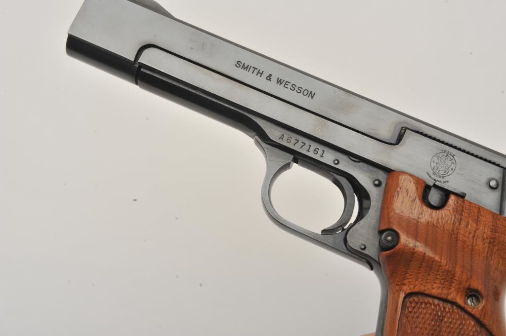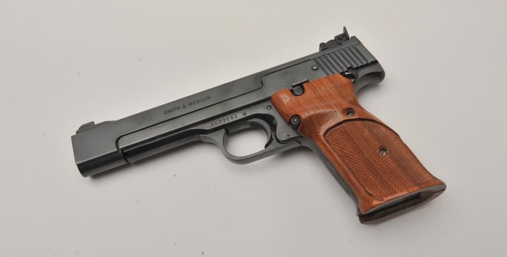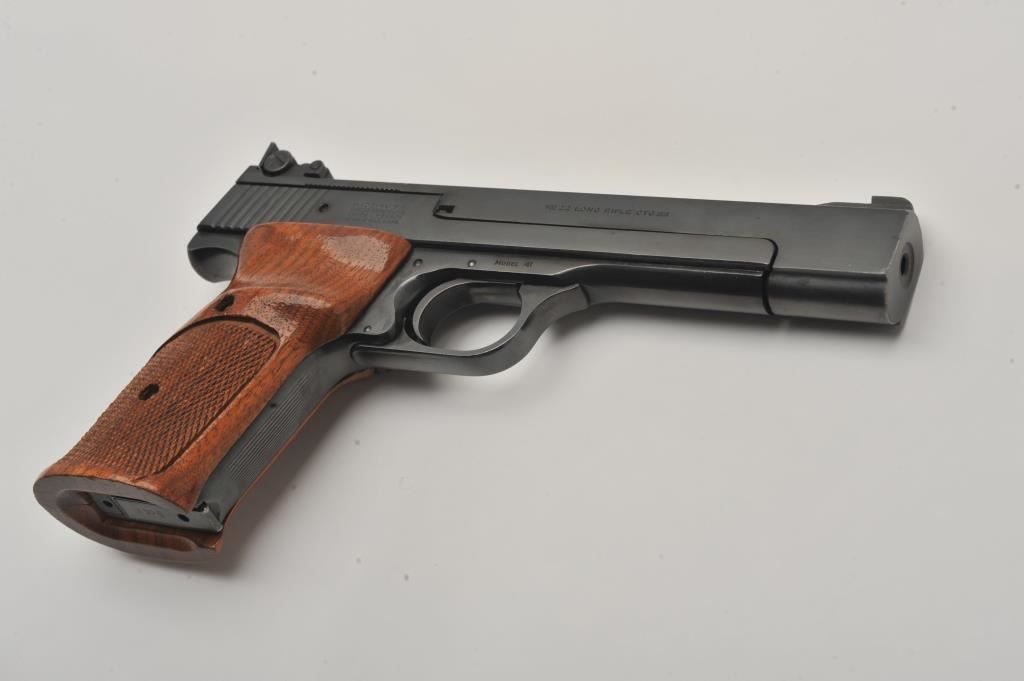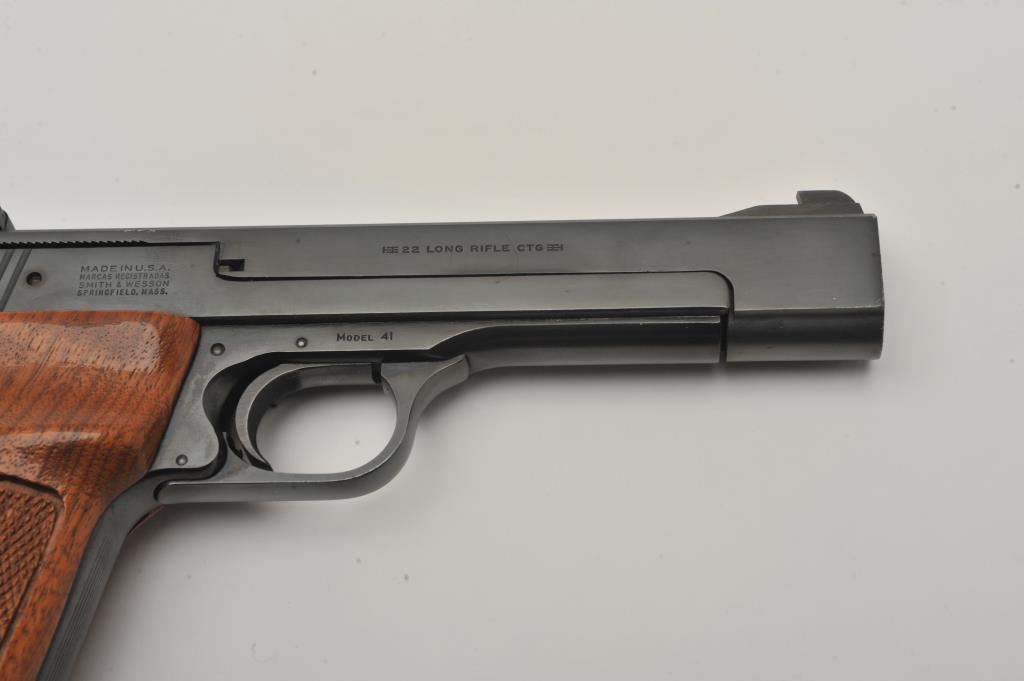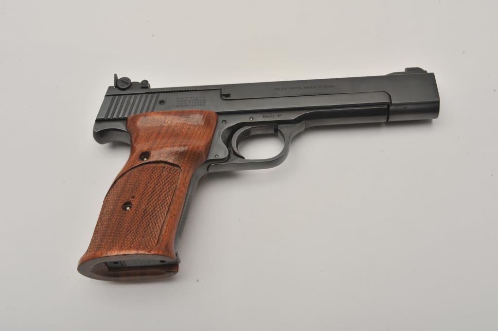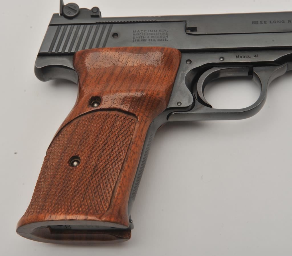Smith & Wesson Model 41 semi-automatic pistol two-barrel set, .22 caliber, Serial #A677161. The pistol is in fine overall condition with a 5 ½” barrel with a ramped blade front and adjustable rear sights. The metal surfaces retain nearly all of their blue finish with wear at the muzzle. The lot includes an additional 7” barrel with a ramped blade front and adjustable rear sights also in fine condition. The checkered wood target style grips are in very good condition with sharp checkering and a flared base. The bore is good, the action crisp and markings are sharp on this desirable pistol. The lot includes one correct S&W marked magazine. Est.: $700-$1,400. (C+R/PPT).
