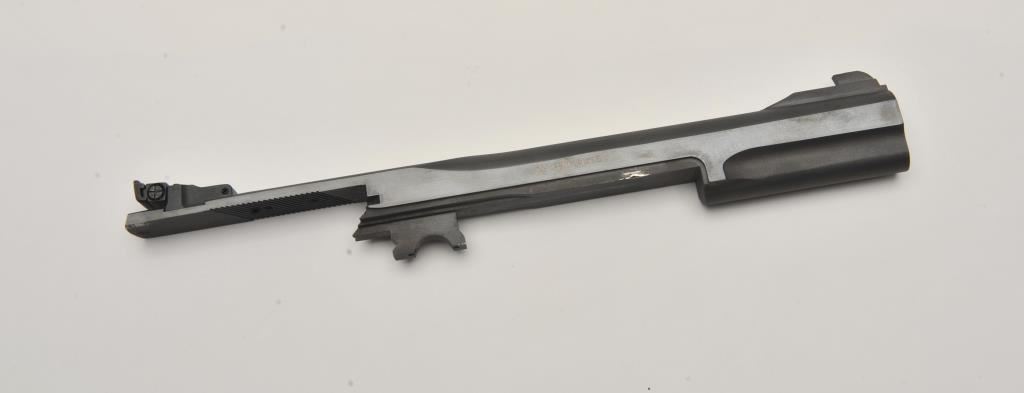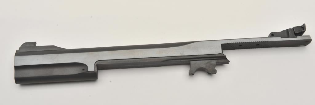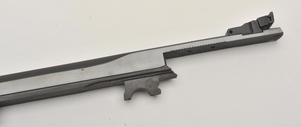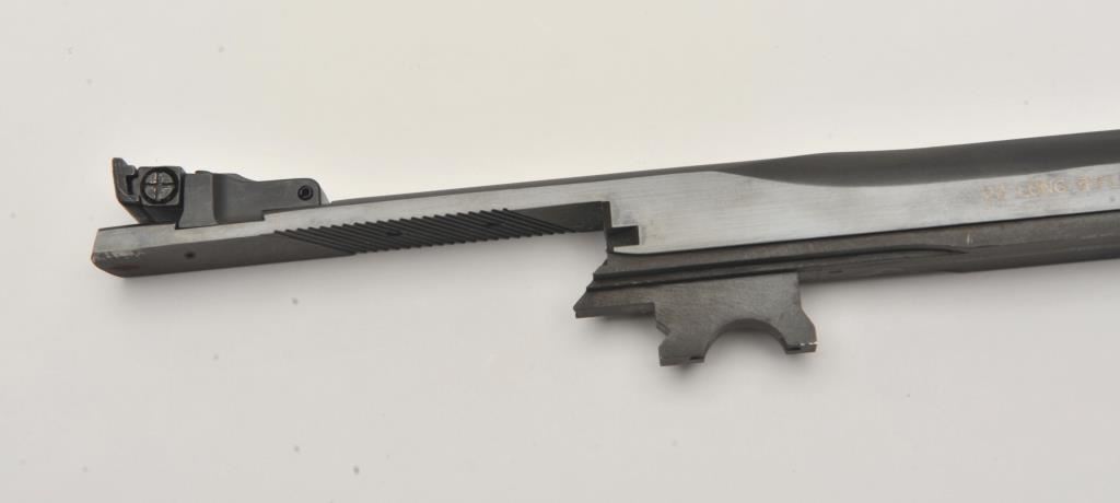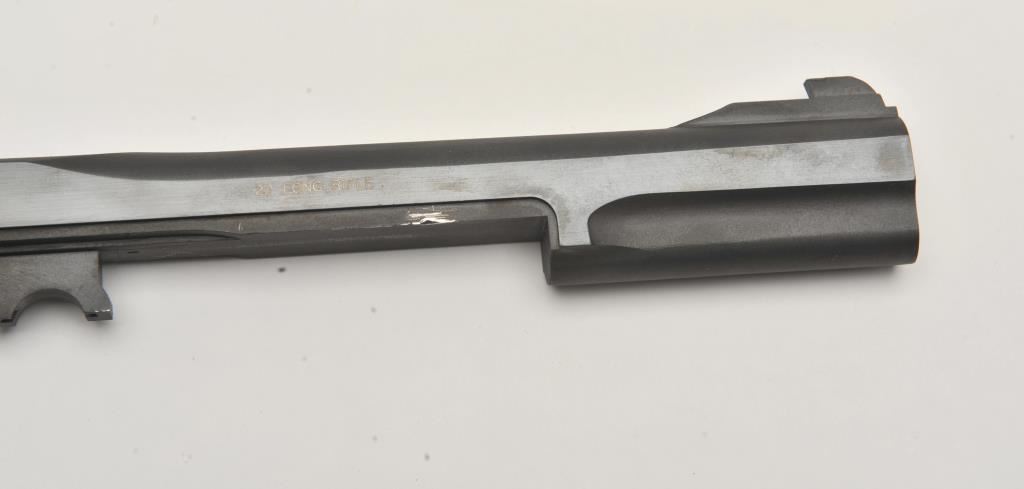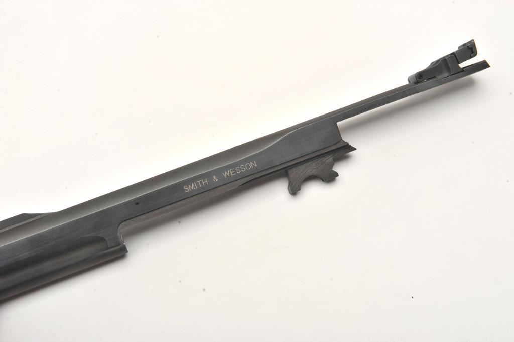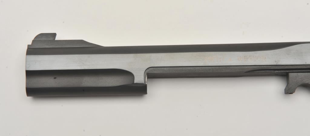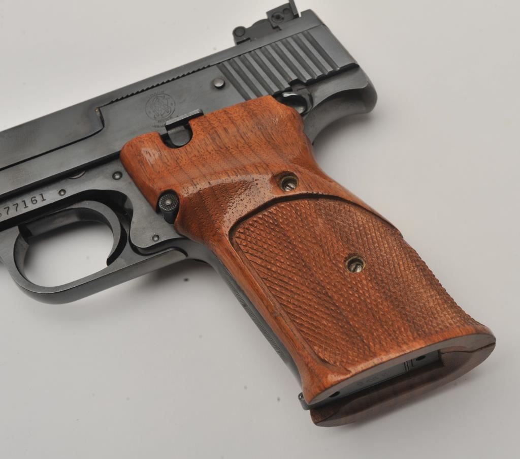 Smith & Wesson Model 41 semi-automatic pistol two-barrel set, .22 caliber, Serial #A677161. The pistol is in fine overall condition with a 5 ½” barrel with a ramped blade front and adjustable rear sights. The metal surfaces retain nearly all of their blue finish with wear at the muzzle. The lot includes an additional 7” barrel with a ramped blade front and adjustable rear sights also in fine condition. The checkered wood target style grips are in very good condition with sharp checkering and a flared base. The bore is good, the action crisp and markings are sharp on this desirable pistol. The lot includes one correct S&W marked magazine. Est.: $700-$1,400. (C+R/PPT).