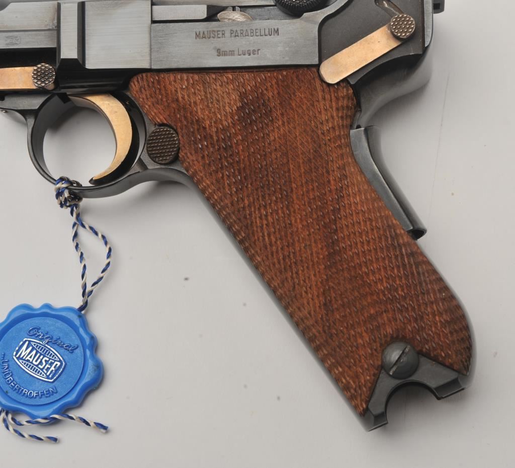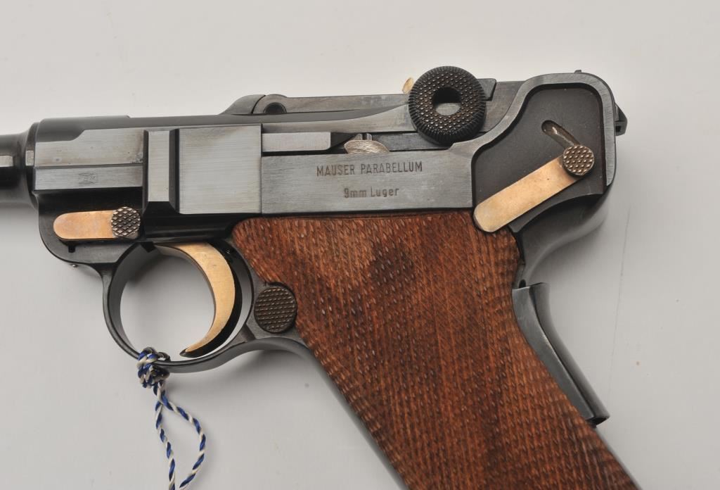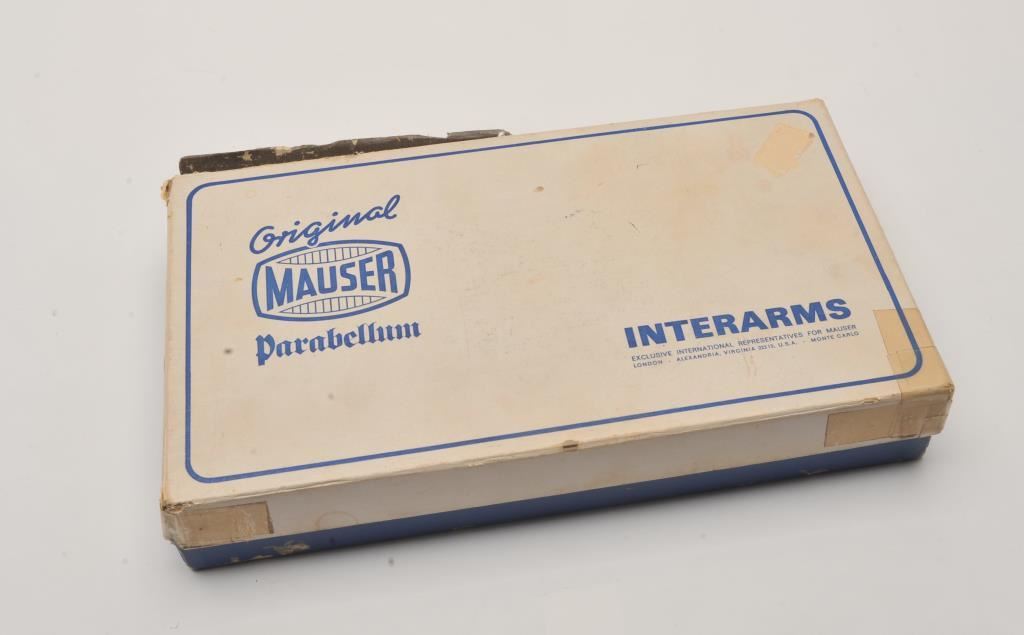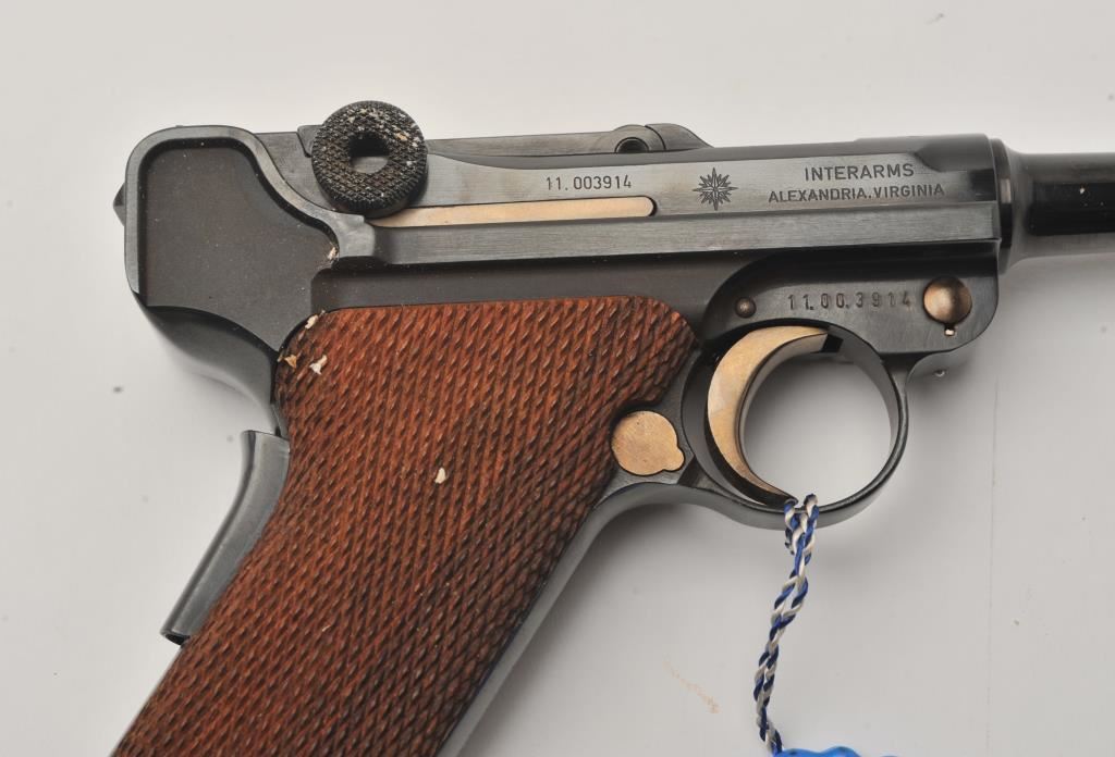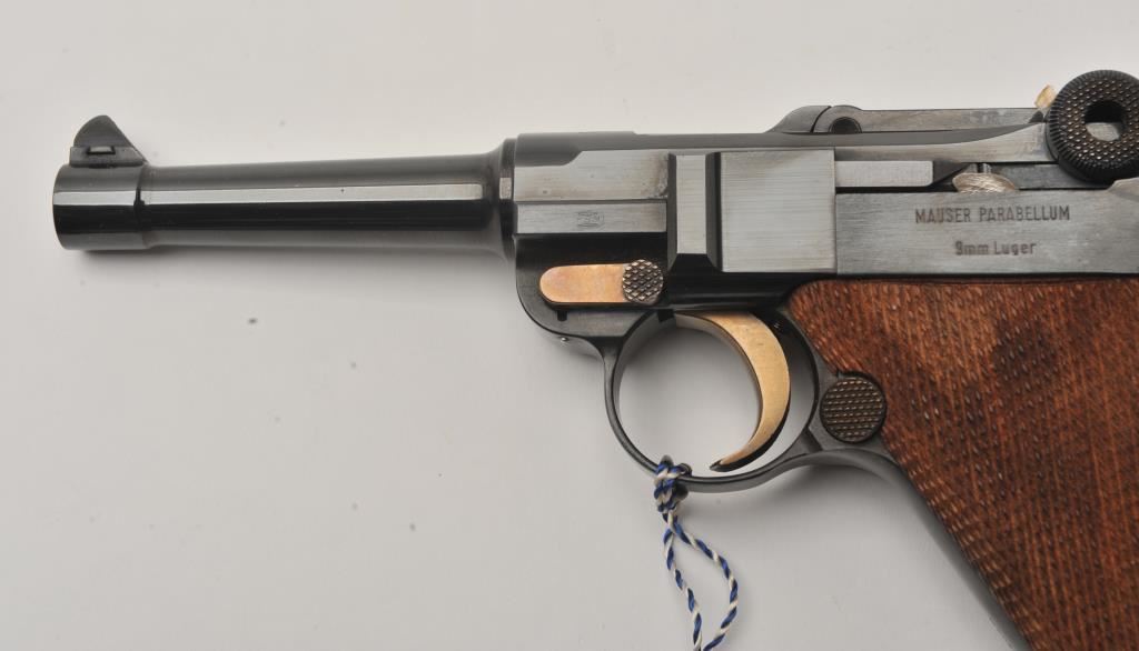 Oberndorf Mauser Luger semi-automatic pistol, 9mm Luger caliber, Serial #3914. The pistol is as new in the factory cardboard box with a 4” barrel. The pistol retains nearly all of its blue finish with only light handling marks. The top of the action has the American Eagle and Mauser emblems. The pistol has significant straw finish remaining on small parts, safety and trigger. The checkered wood grips are in excellent condition with sharp checkering. The lot includes two correct, Mauser marked magazines, cleaning rod and all associated packaging in the factory box. Est.: $800-$1,600. (Modern/PPT).