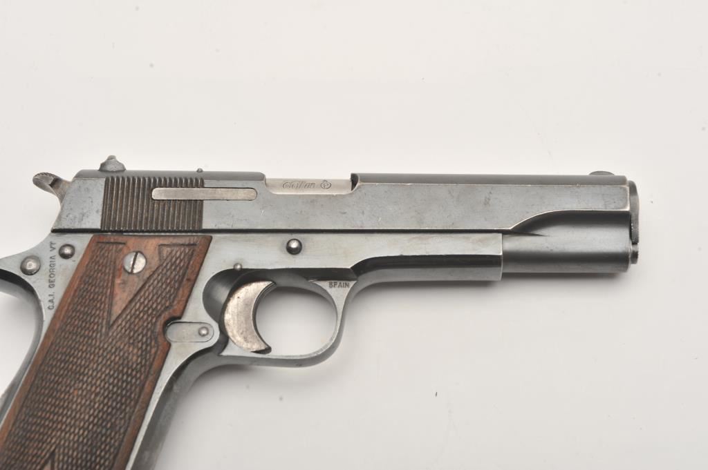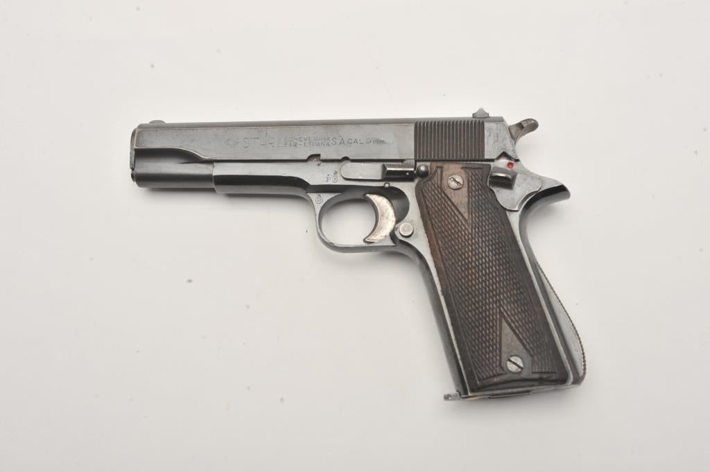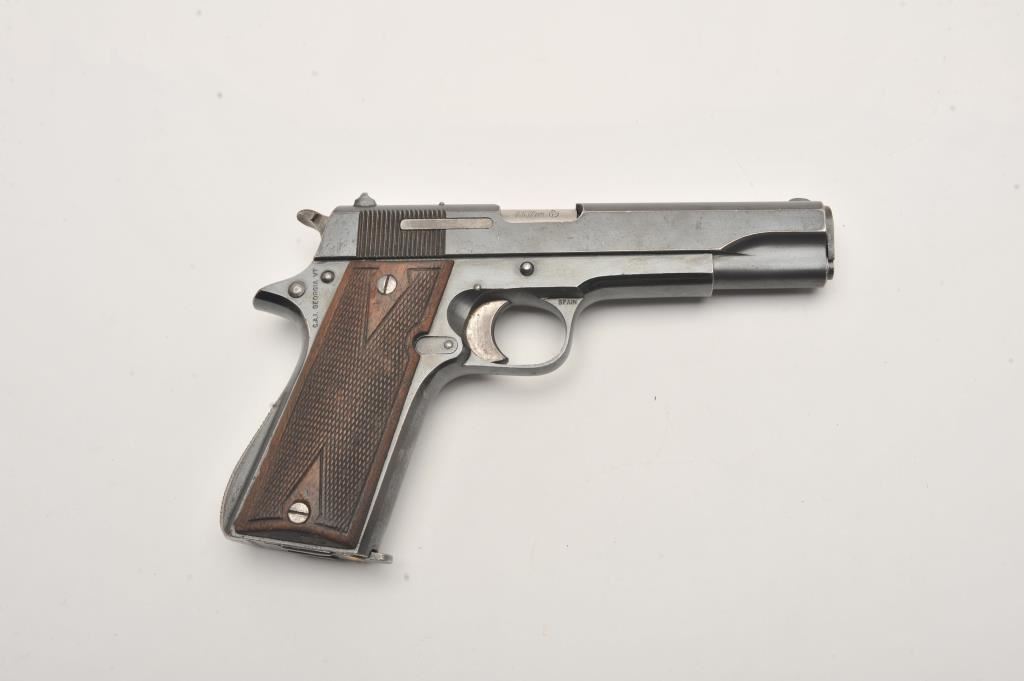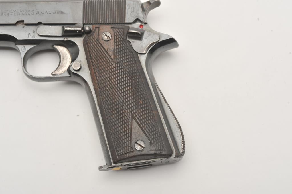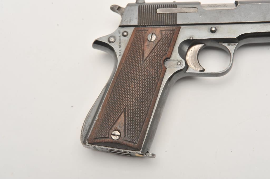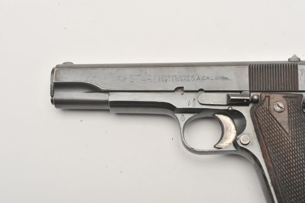 Star Model B semi-automatic pistol, 9mm caliber, Serial #269165. The pistol is in good overall condition with a 5” barrel. The pistol retains a significant amount of muted blue finish with holster wear at the muzzle and high point edge wear on the slide. The frame has proof marks on the left side and is import marked on the right. The checkered wood grips are in good condition with mars, compressions and some flattening of the checkering. The bore is good, the action functions and the markings are legible. The lot includes one correct magazine. Est.: $275-$550. (C+R/PPT).