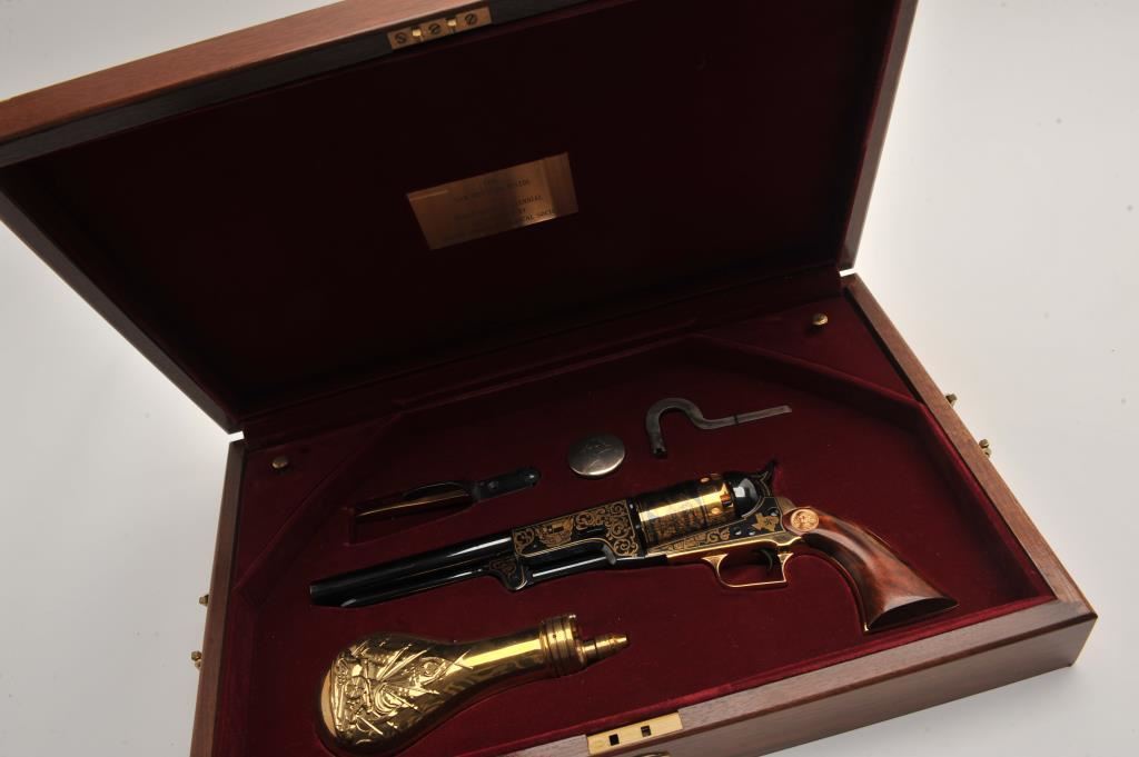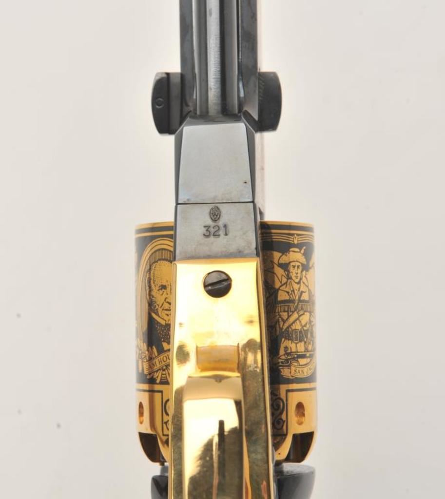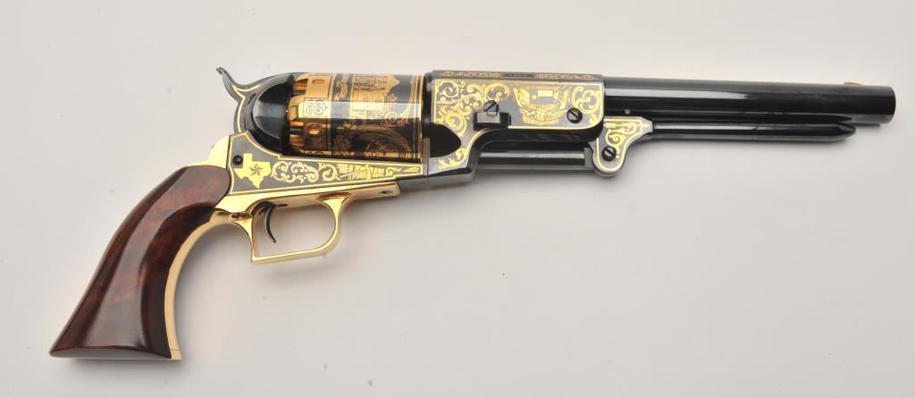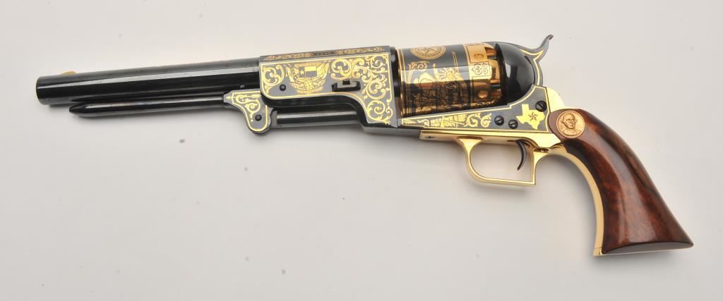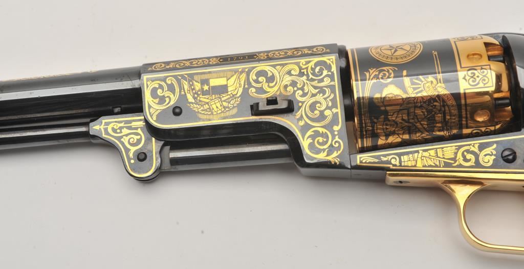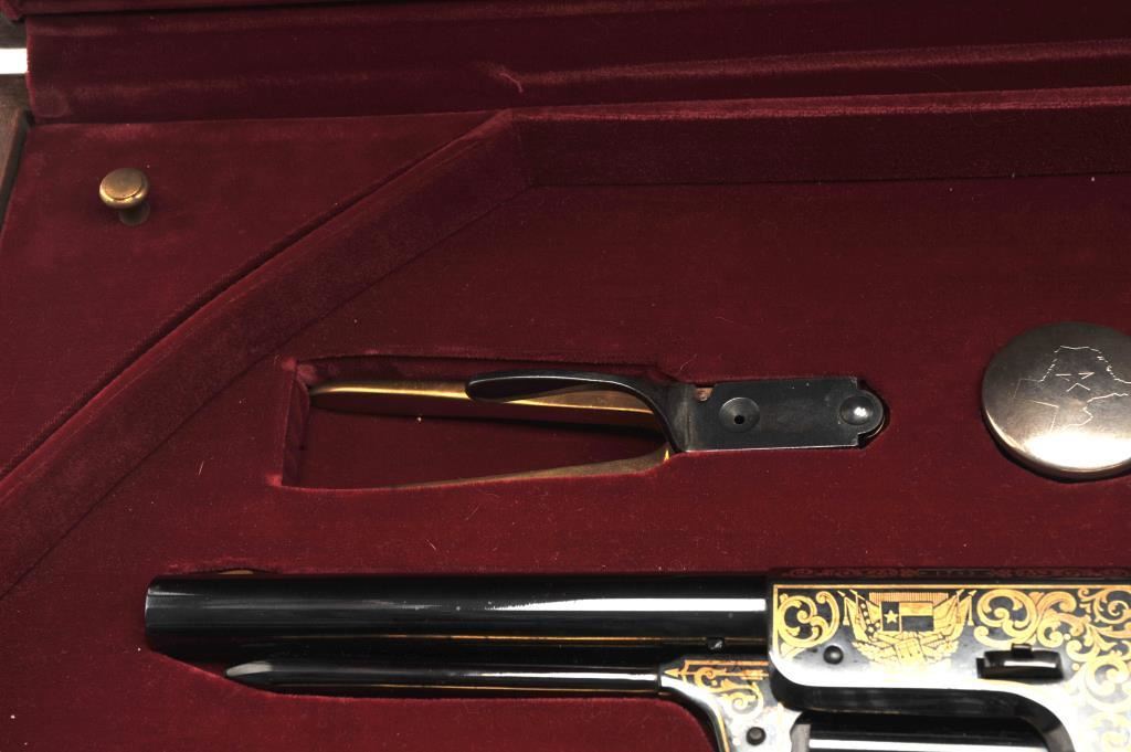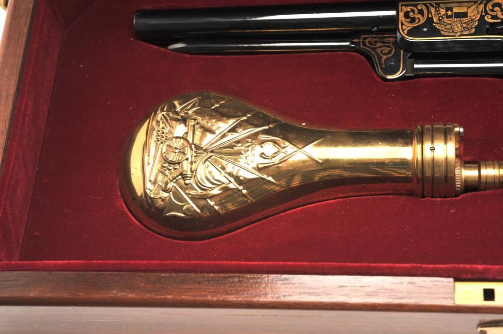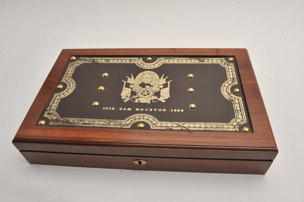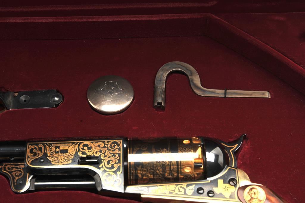 Sam Houston Texas Sesquicentennial Walker pistol. The pistol is beautifully cased in a Walnut and leather display case 20” x 12”, with gold embossed type, “1793 SAM HOUSTON 1863” and brass studs on the lid. The cased set, manufactured by Uberti and authorized by the United States Historical Society, features an ornately decorated reproduction Walker percussion revolver, Serial #321, finished in deep, polished blue and gold tone. The case is lined with maroon velvet and includes the powder flask, mold, wrench and Silver cap tin. A beautiful set in fine overall condition made in 1984 in honor of the 150th anniversary of Texas. The set is part of a limited edition of 2,500 manufactured. Est.: $1,000-$2,000.