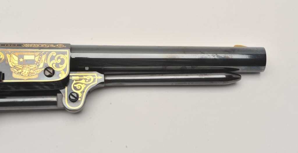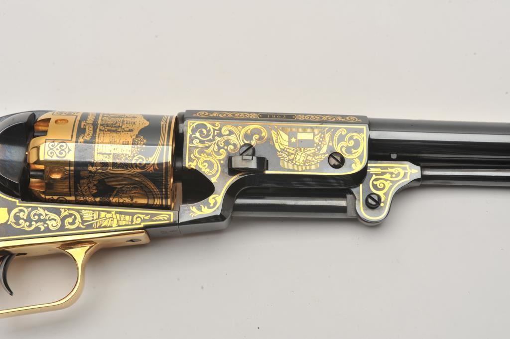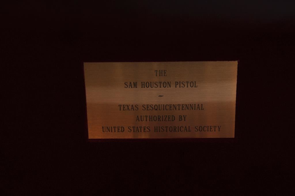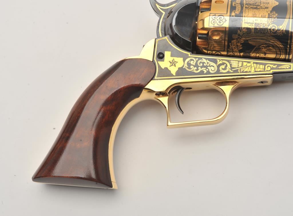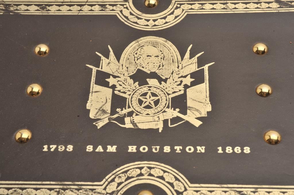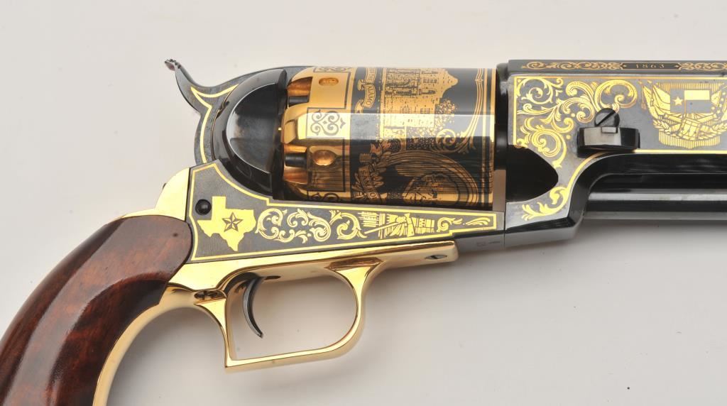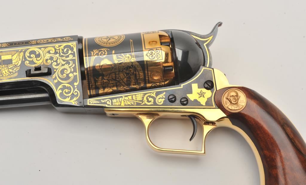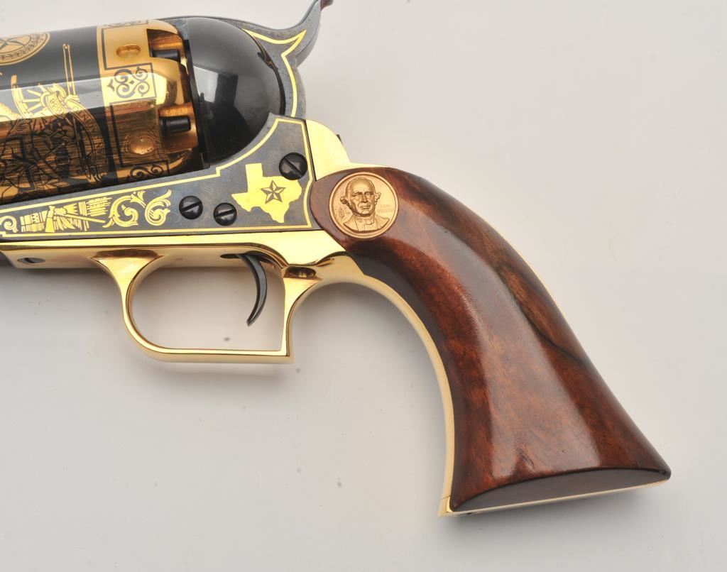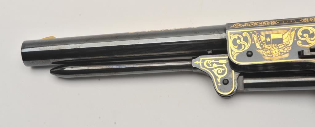 Sam Houston Texas Sesquicentennial Walker pistol. The pistol is beautifully cased in a Walnut and leather display case 20” x 12”, with gold embossed type, “1793 SAM HOUSTON 1863” and brass studs on the lid. The cased set, manufactured by Uberti and authorized by the United States Historical Society, features an ornately decorated reproduction Walker percussion revolver, Serial #321, finished in deep, polished blue and gold tone. The case is lined with maroon velvet and includes the powder flask, mold, wrench and Silver cap tin. A beautiful set in fine overall condition made in 1984 in honor of the 150th anniversary of Texas. The set is part of a limited edition of 2,500 manufactured. Est.: $1,000-$2,000.